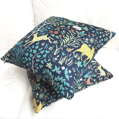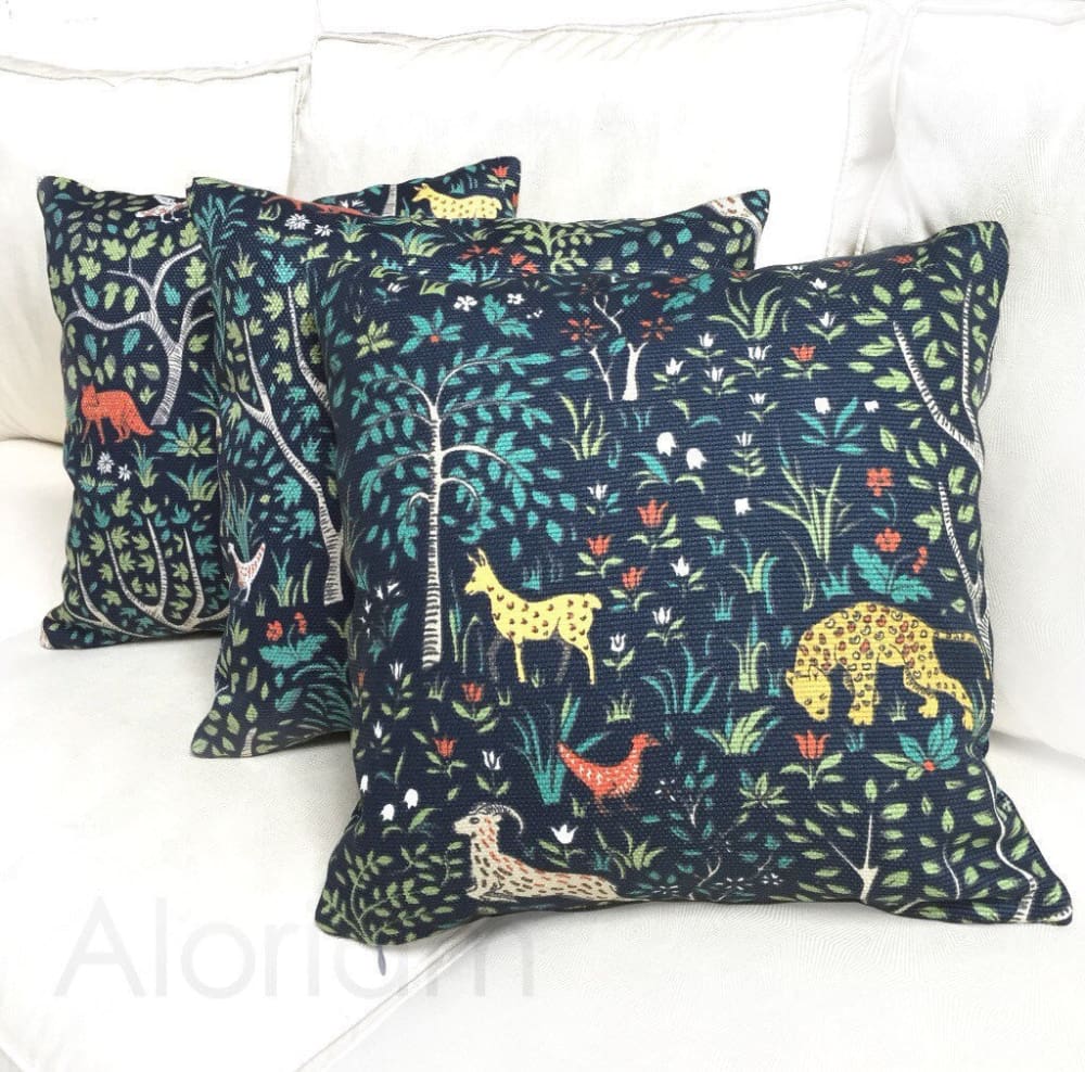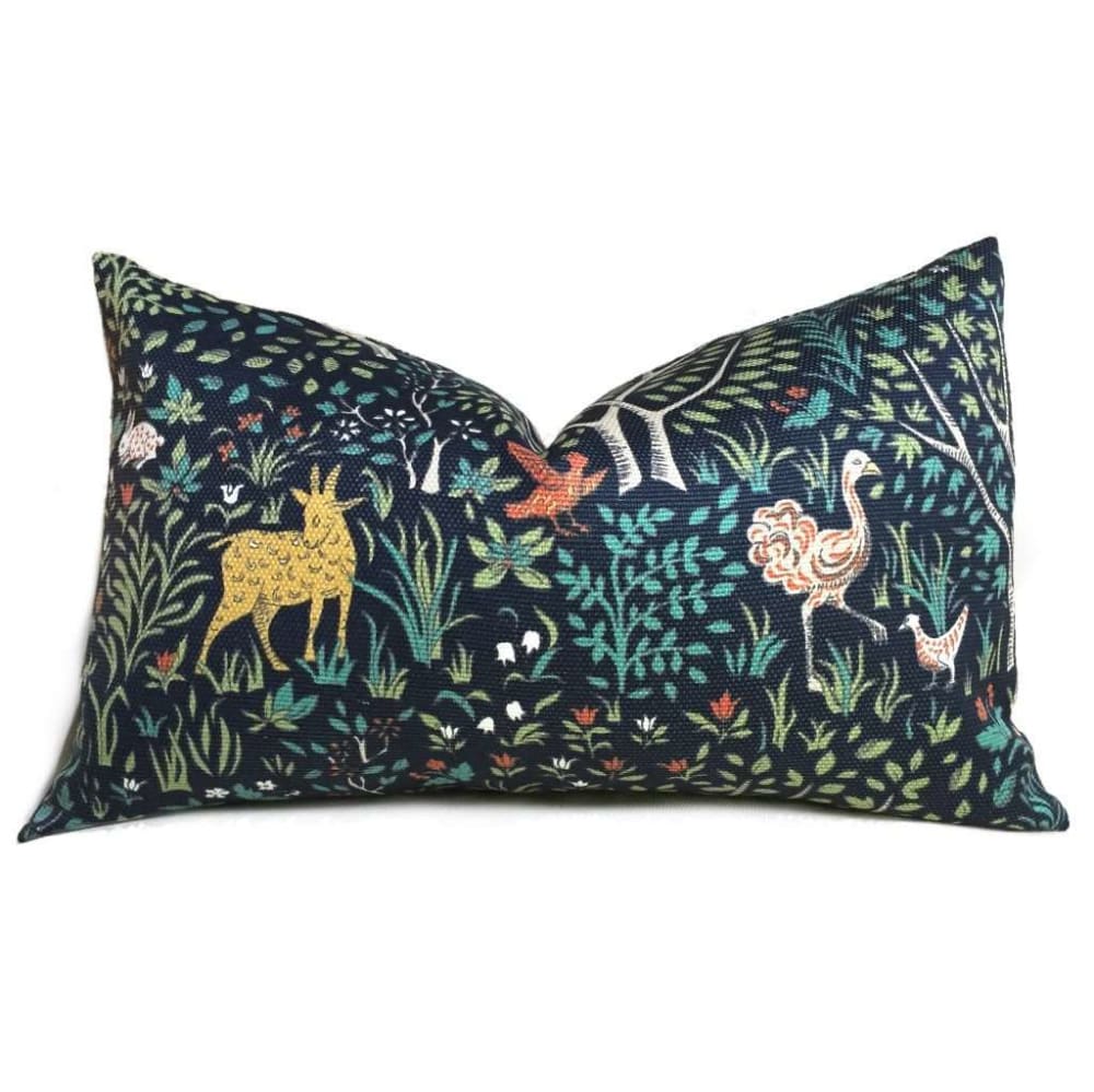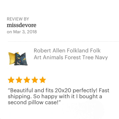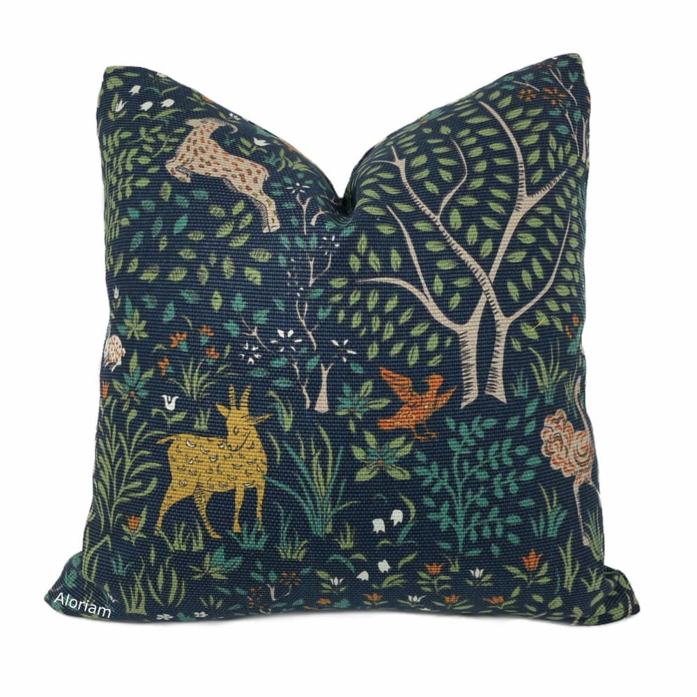 This Robert Allen Folkland throw pillow design features a whimsical folk art print of forest animals frolicking amongst green trees. Multiple colors of yellow, orange, white and teal printed on a navy blue background ensure this delightful designer pillow cover will look smashing in many decors.