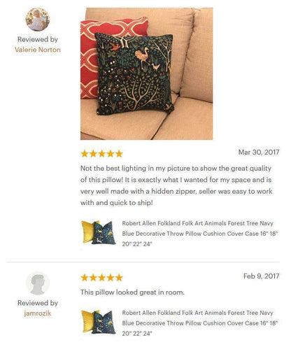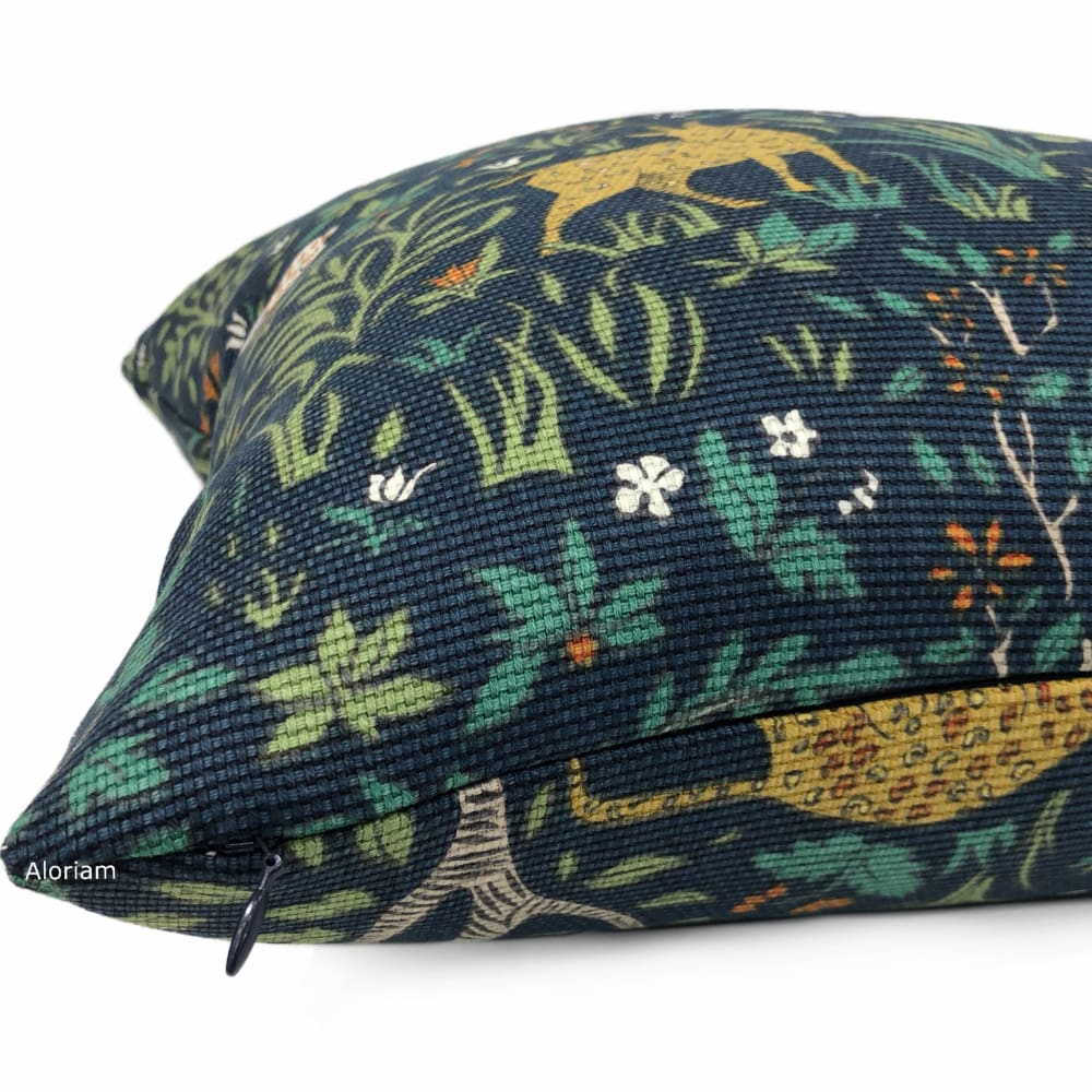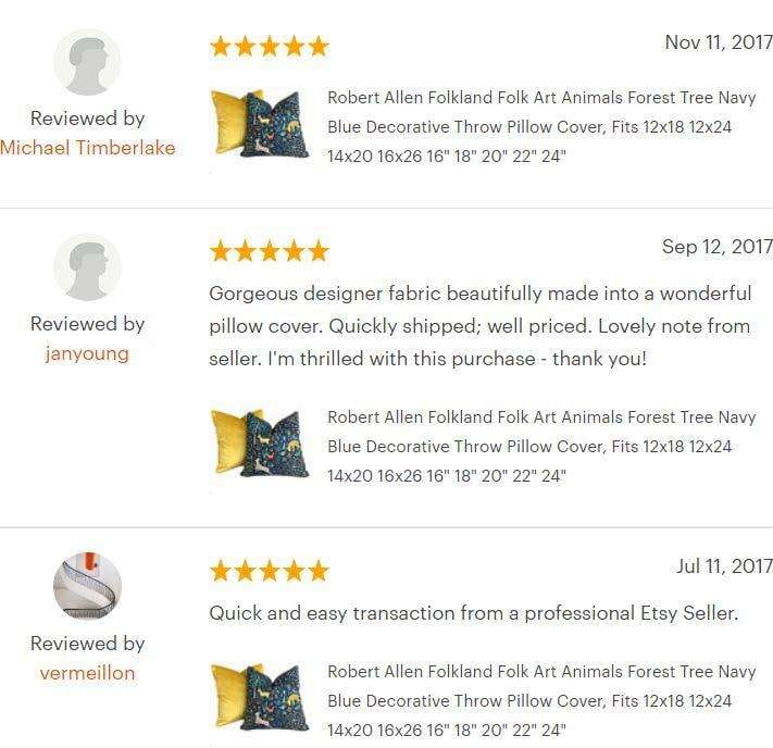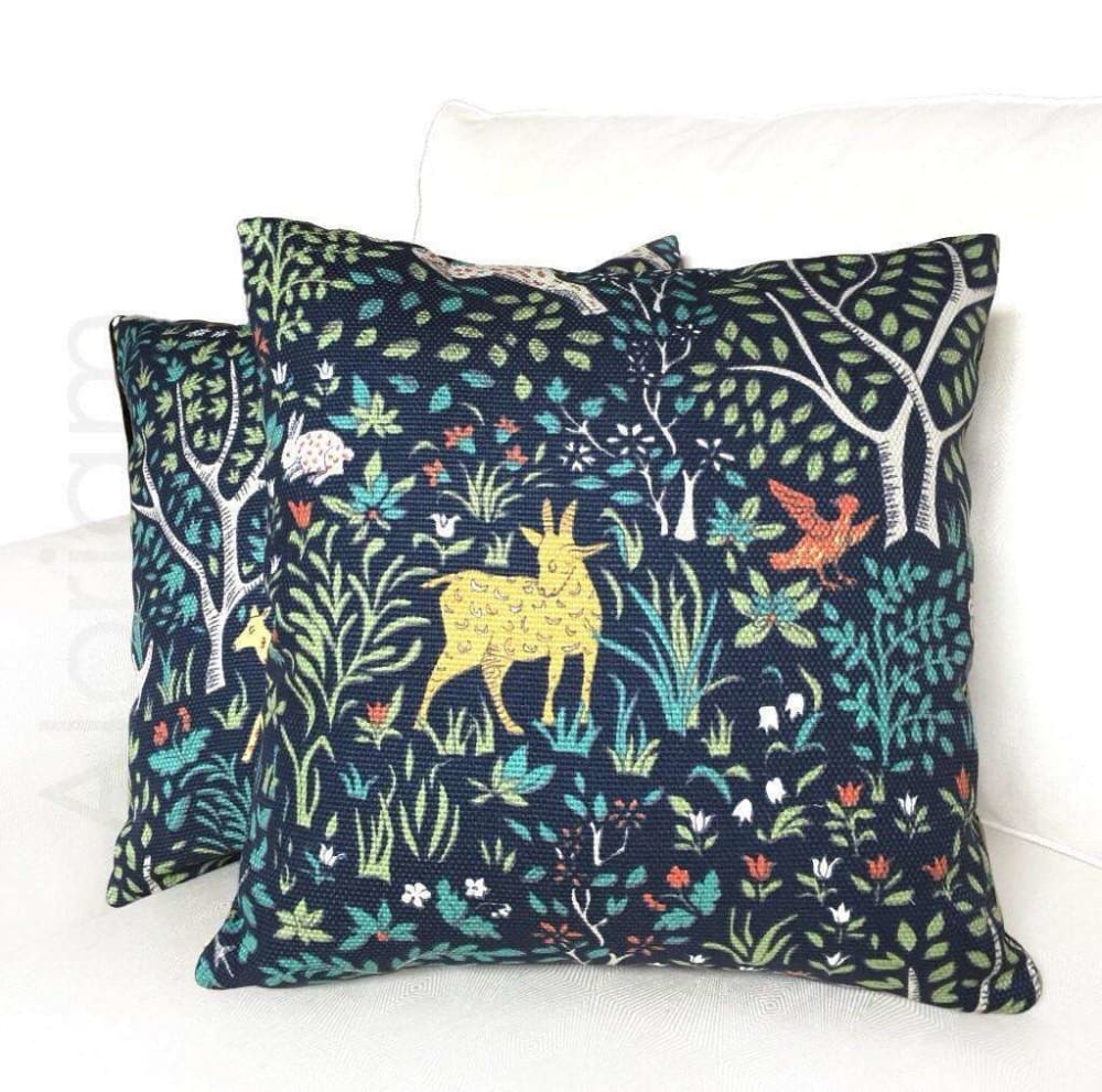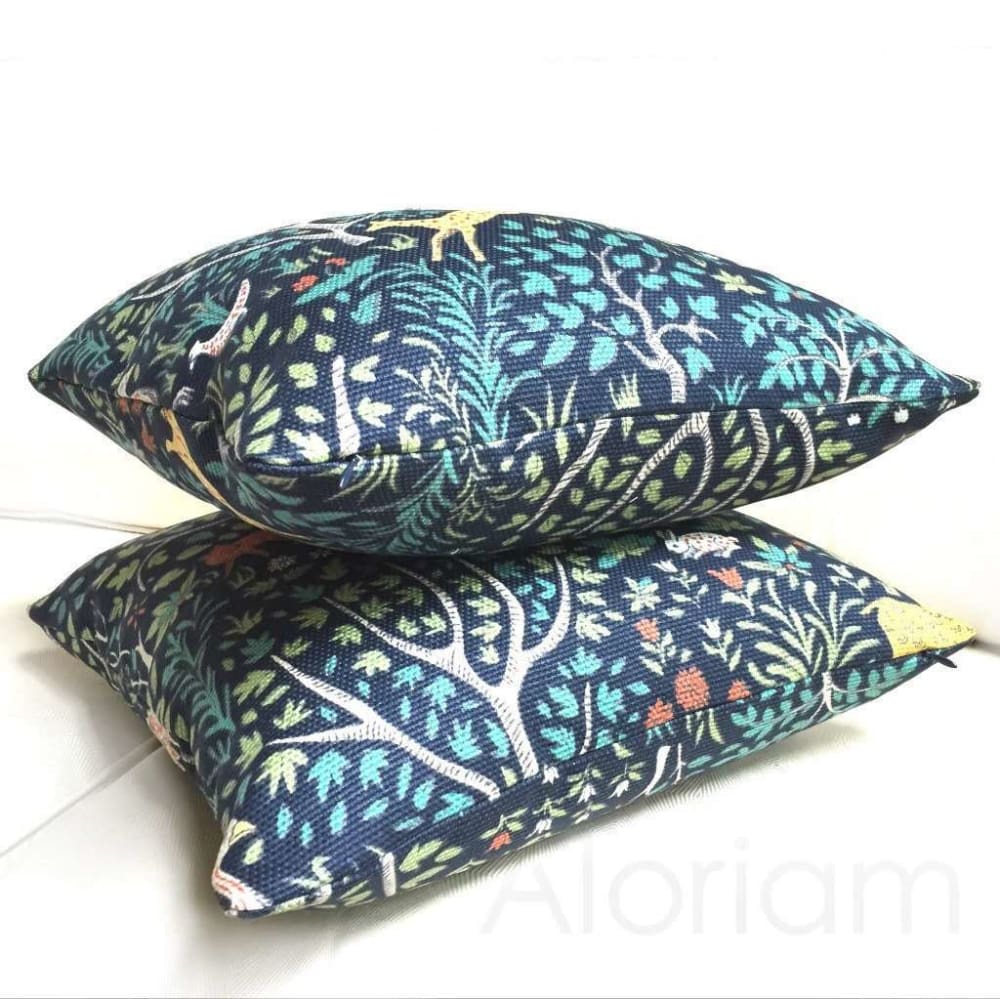This Robert Allen Folkland throw pillow design features a whimsical folk art print of forest animals frolicking amongst green trees. Multiple colors of yellow, orange, white and teal printed on a navy blue background ensure this delightful designer pillow cover will look smashing in many decors.