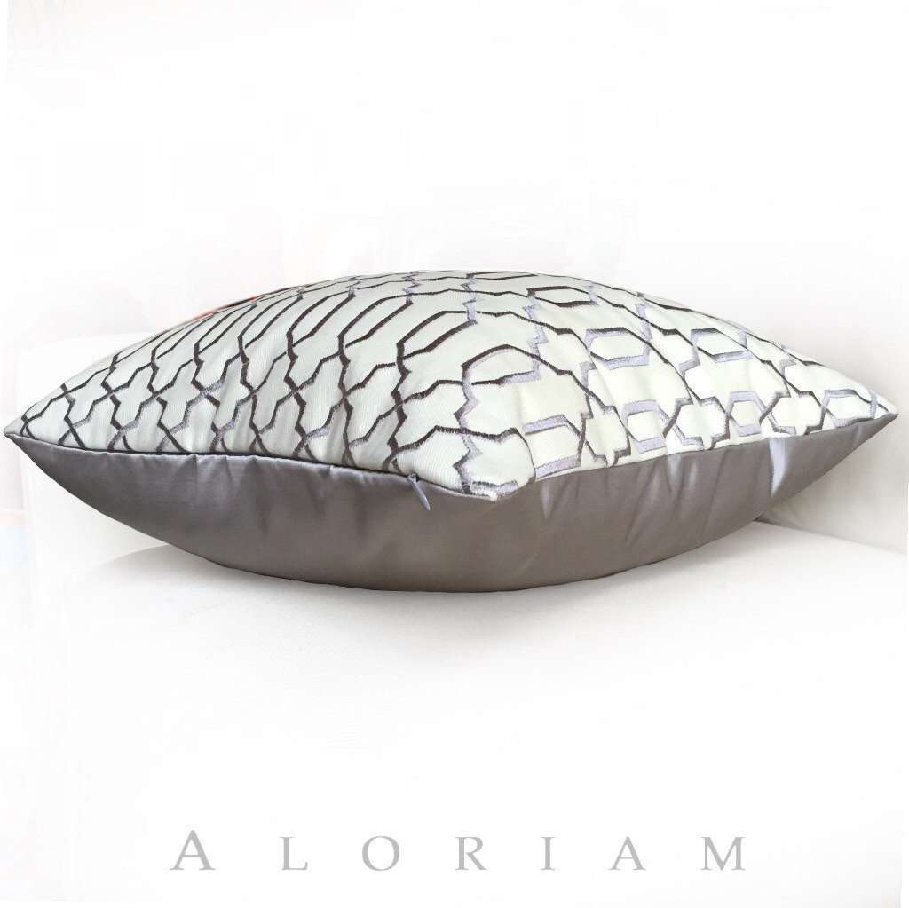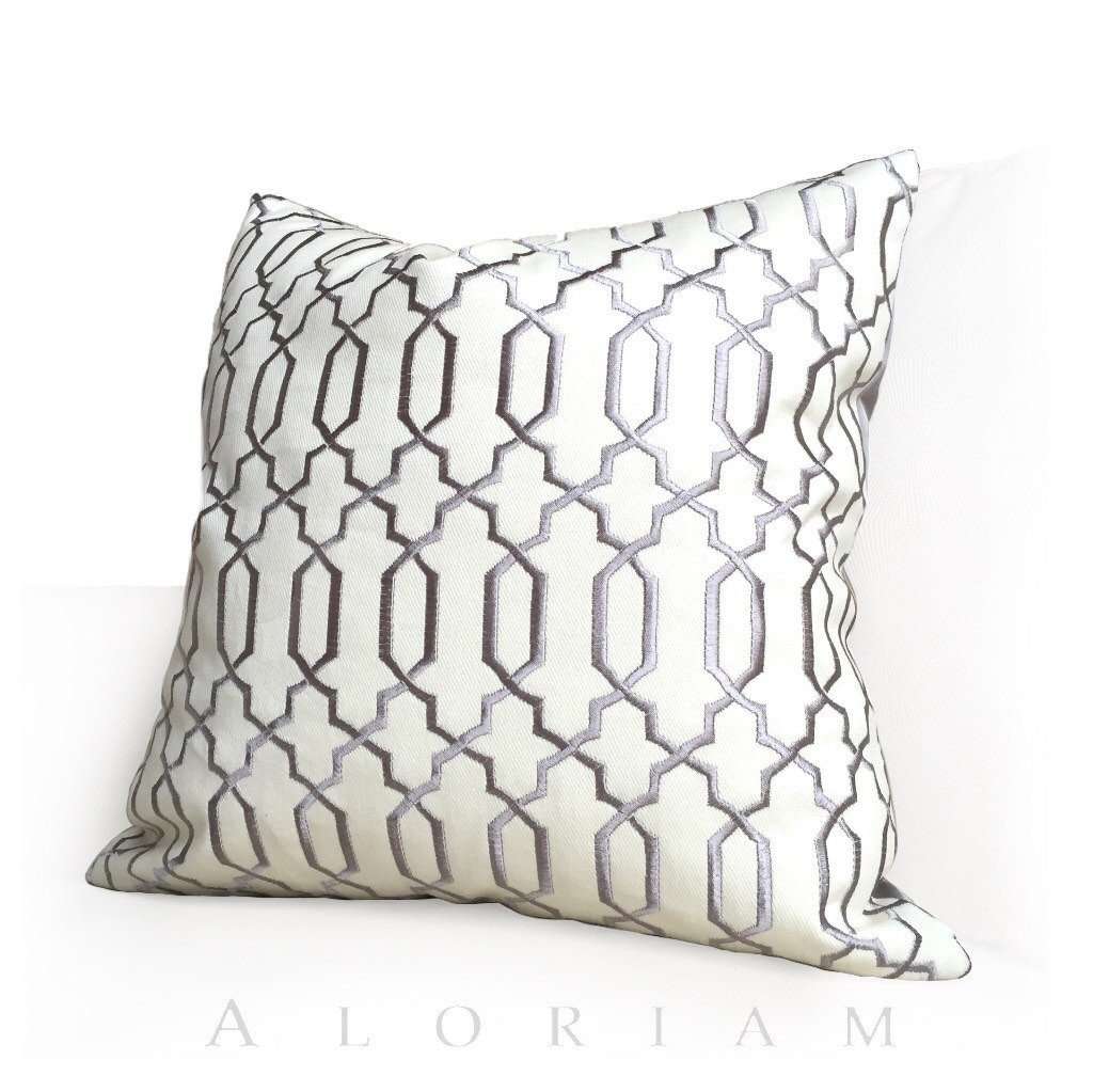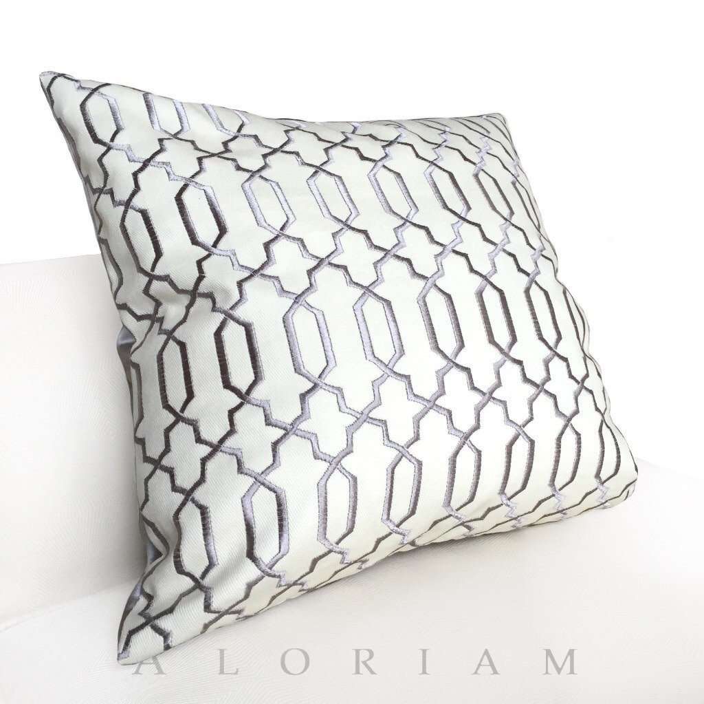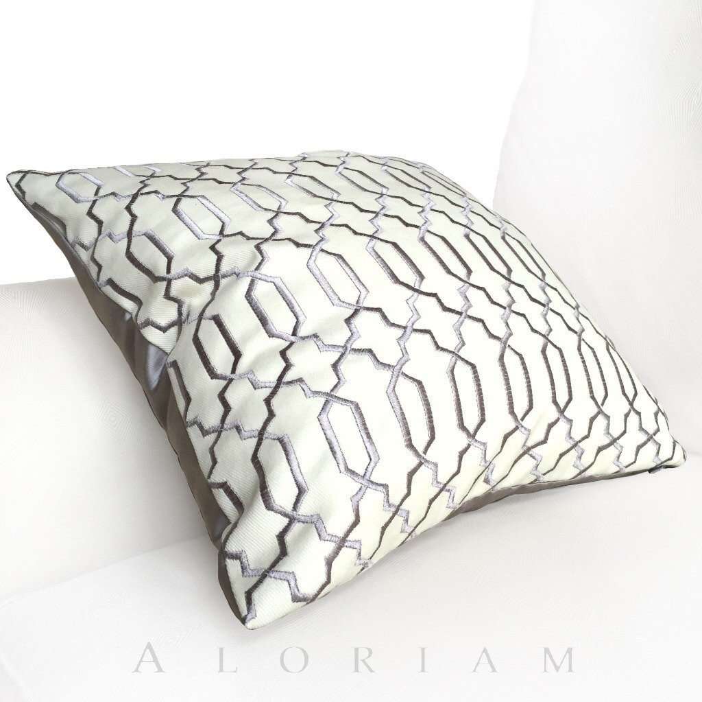 This gray and cream embroidered fretwork pillow cover is a classic and graceful additional to any home interior! The dense embroidery is a shiny silver gray offset against a cream cotton twill background.