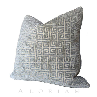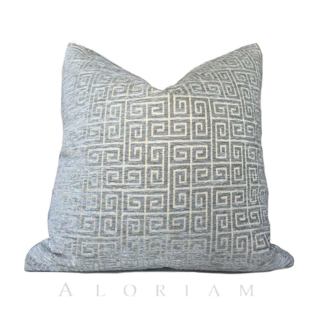 This pillow cover made from a designer fabric by Robert Allen features a classic greek key geometric pattern woven in cloudy bluish-green-gray on a beige background. Robert Allen aptly named this colorway "Rain", and it is a shade somewhere in the intersection of green, blue and gray.