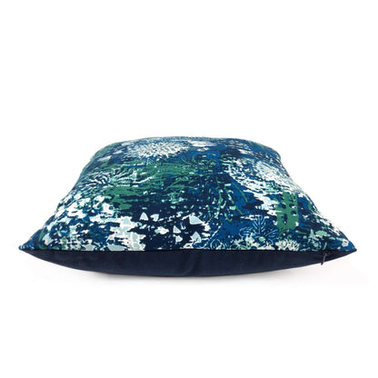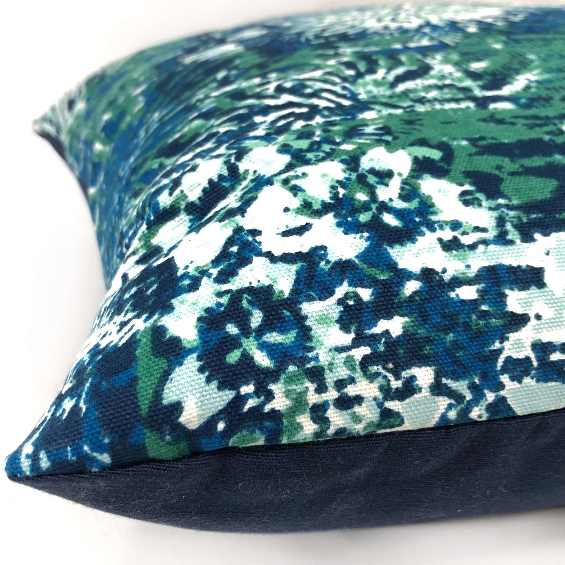 This modern floral pillow cover features an all-over abstract flower pattern printed in blue, green and teal with white accents. Pattern front side with coordinating solid teal backside. Photos show the 15.5x15.5 inch cover size (filled with a 16x16 insert).