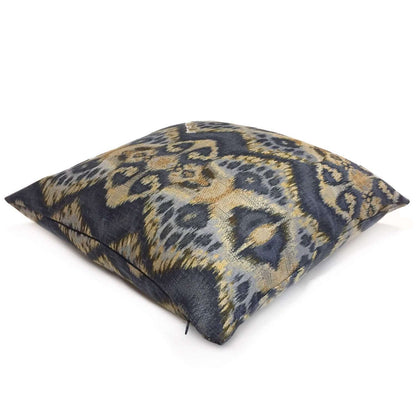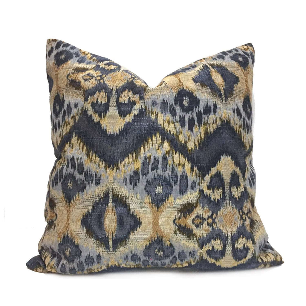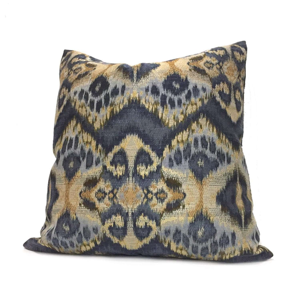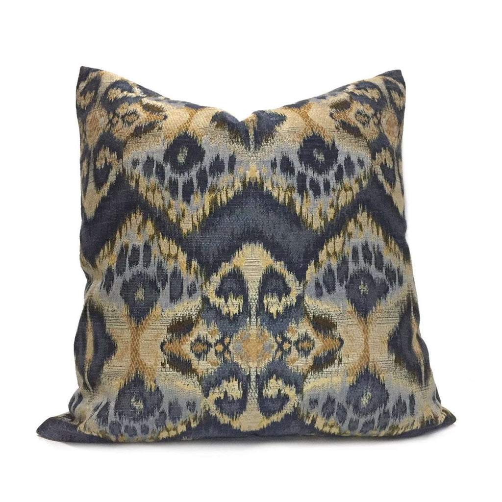 Almost sold out! This pillow cover features a chic ikat tribal ethnic pattern woven in a spectacular array of colors in the blue and beige family. Made from a durable upholstery weight fabric from Robert Allen. Photographed on 19x19 cover (filled with 20x20 insert).