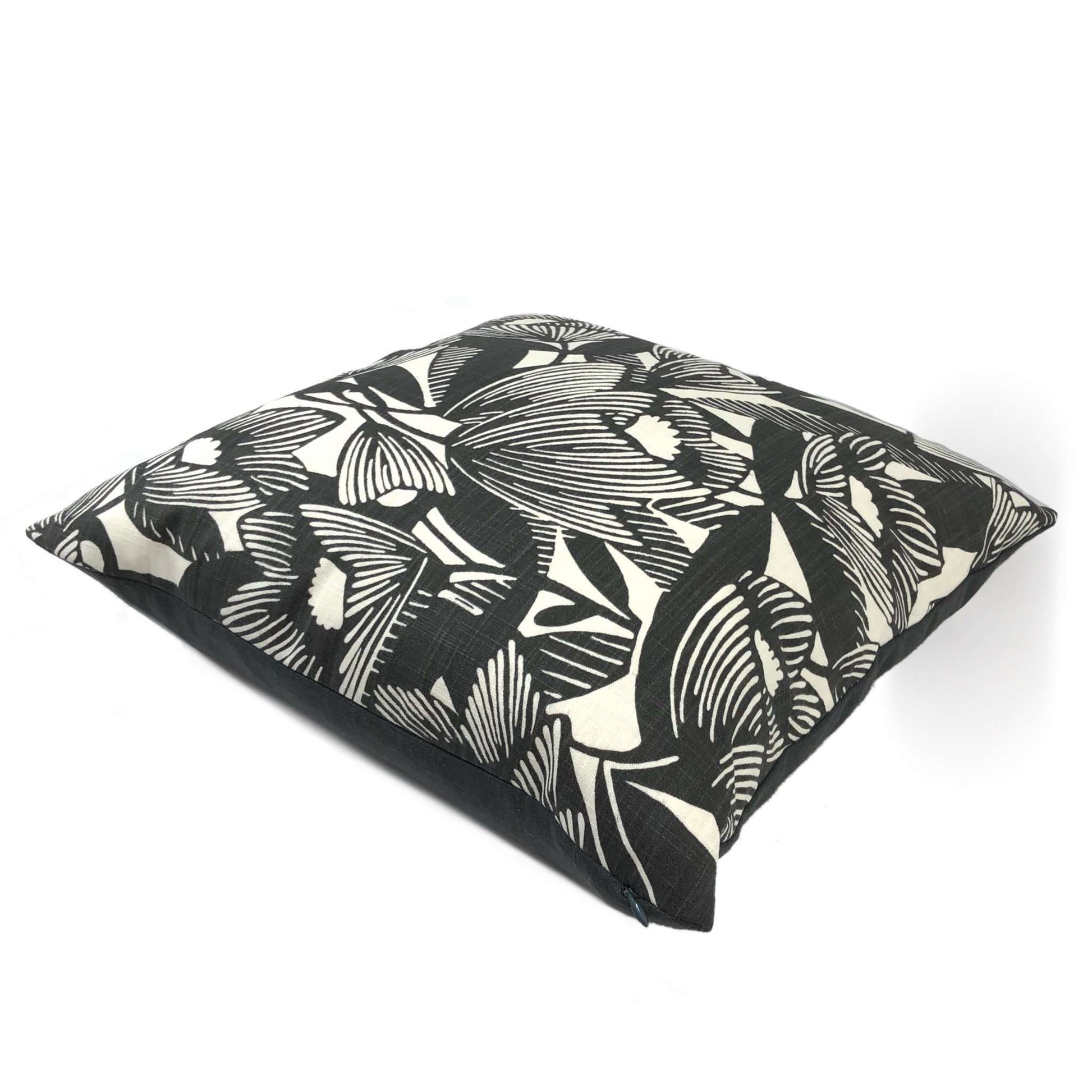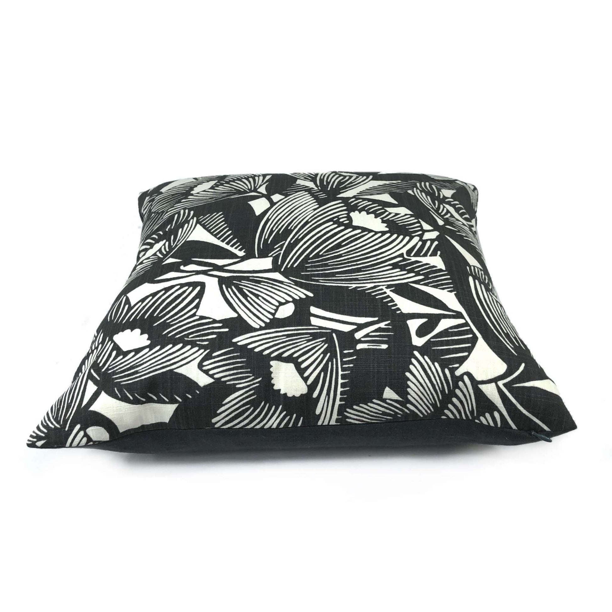 This modern floral pillow cover features an all-over abstract flower pattern designed by Dwell Studio for Robert Allen. The floral design is printed in soft black on a white background. The pattern is screenprinted on 100% cotton home décor fabric and is used on your choice of one or both sides of the cover. Photographed on 19x19 cover (filled with 20x20 insert).