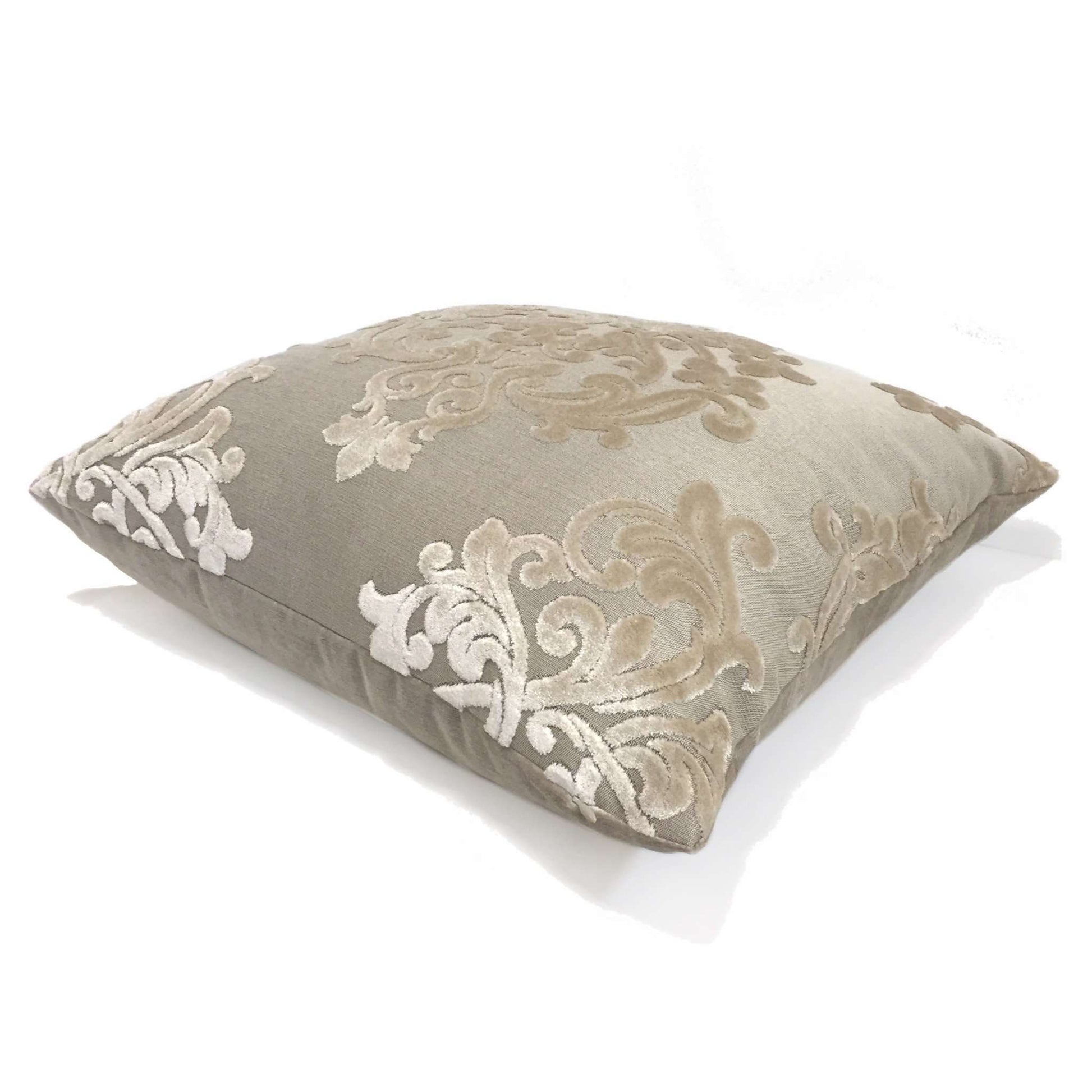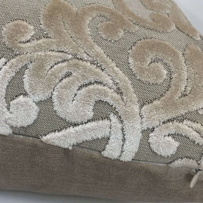 Last two! The Royal Beauty pillow cover features a grand damask medallion woven in cream cut velvet on a neutral beige background.