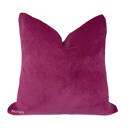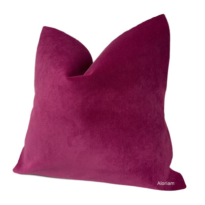 This raspberry pink velvet pillow cover features a juicy saturated shade of dark berry pink. This durable polyester velvet fabric woven by Robert Allen has a rating of 50,000 double rubs on the abrasion scale.