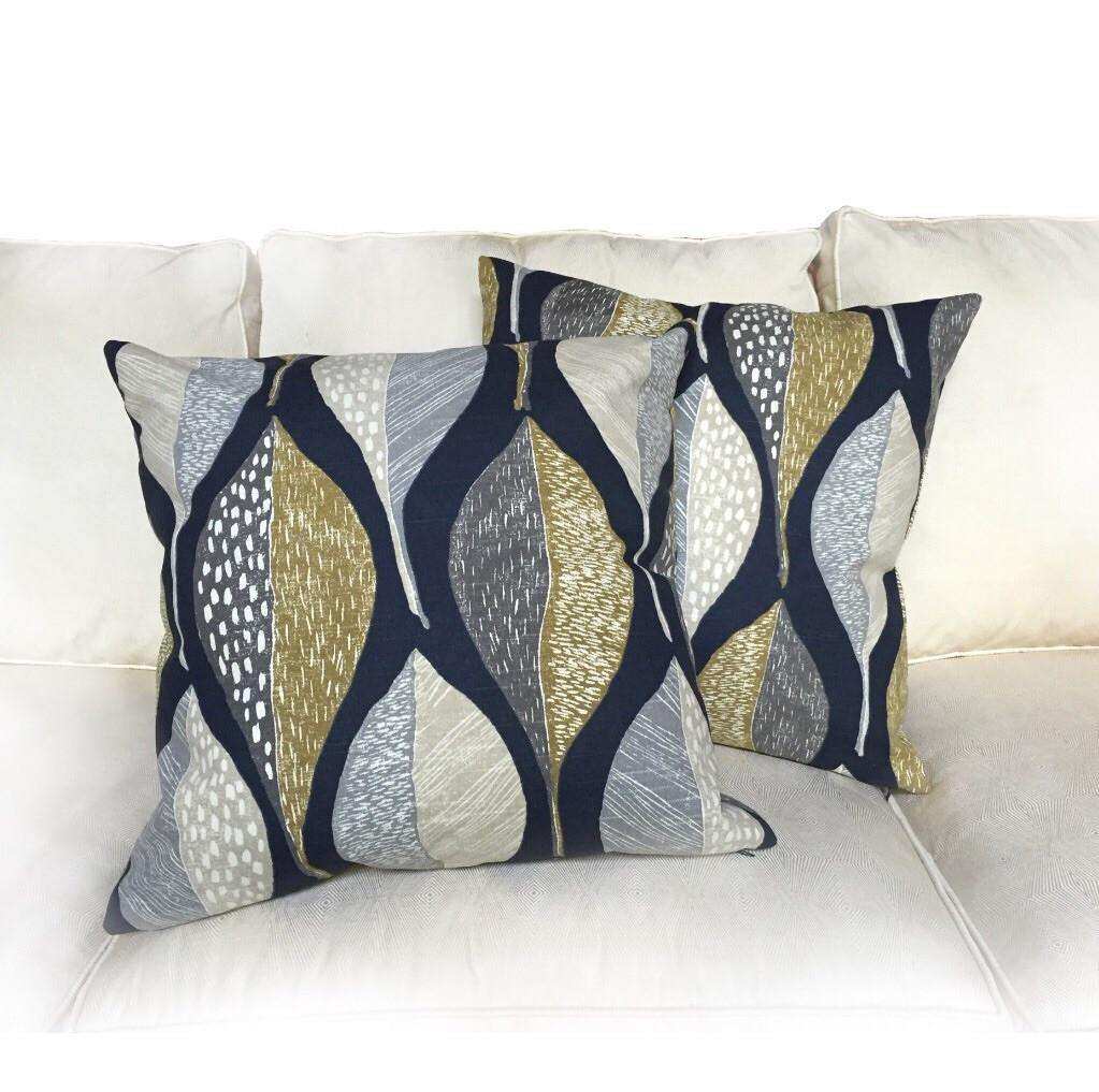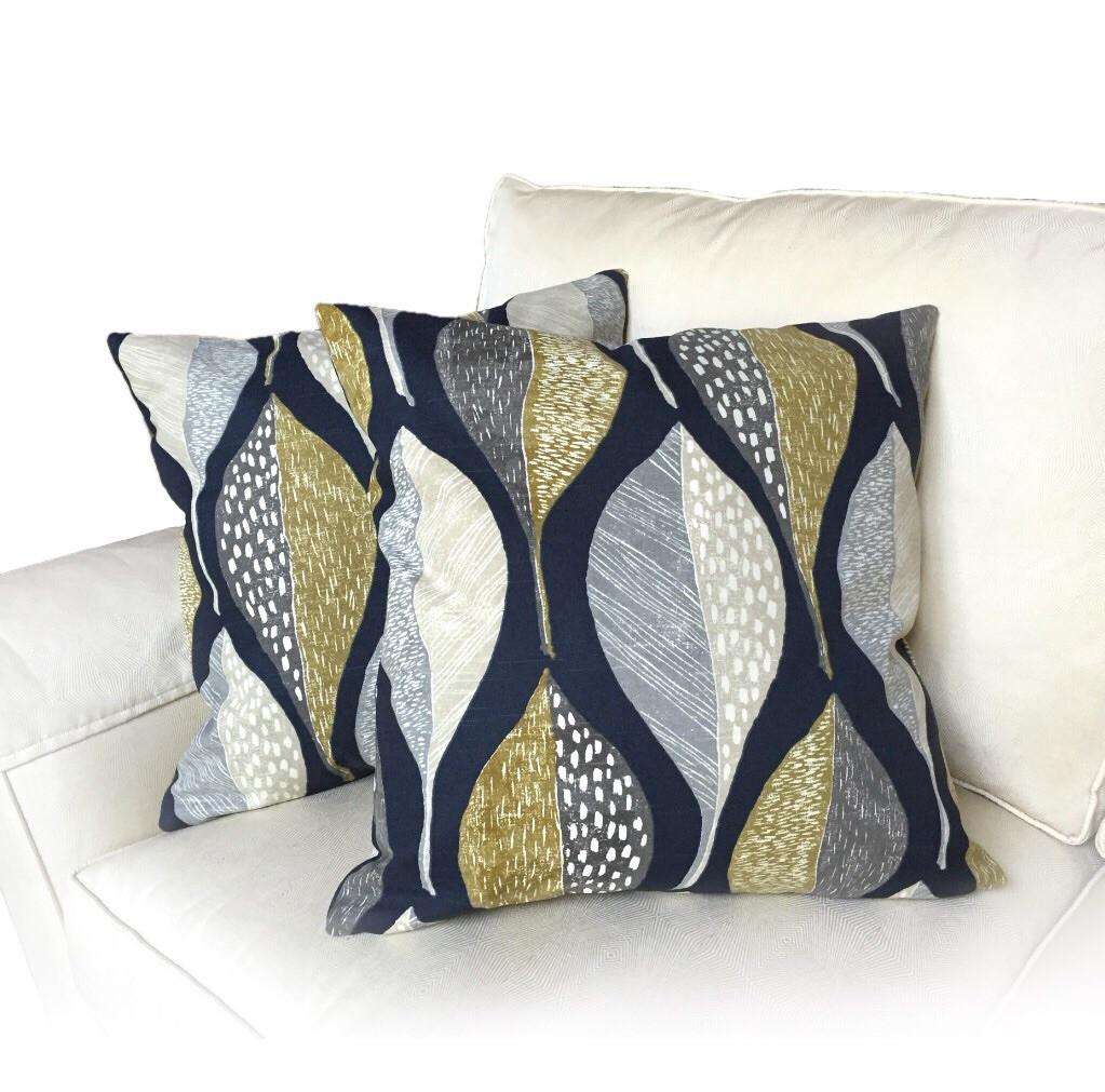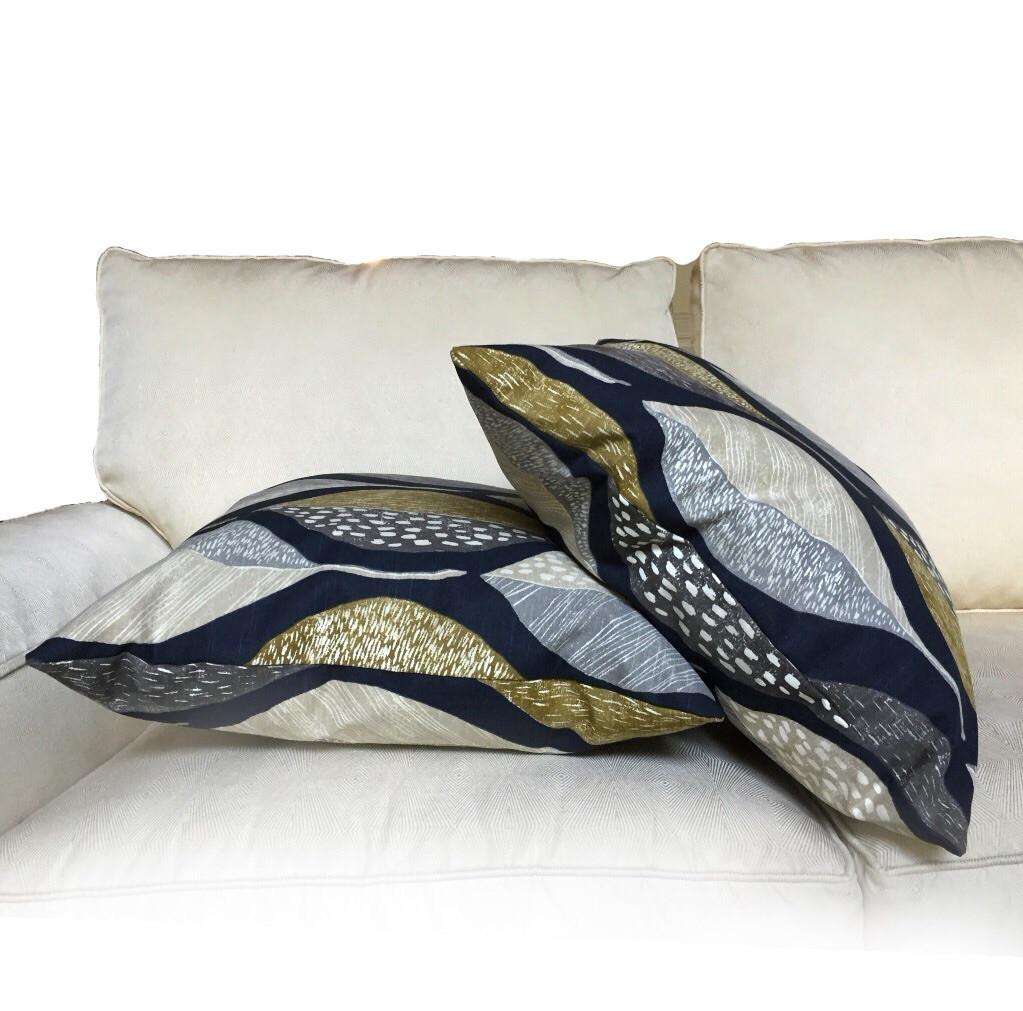 This contemporary Robert Allen botanical print of large scale leaves, this eye catching pillow cover features colors of gray, tan beige, olive green on a background of very dark blue, almost black-blue. Pattern fabric front side with solid dark navy blue backside.