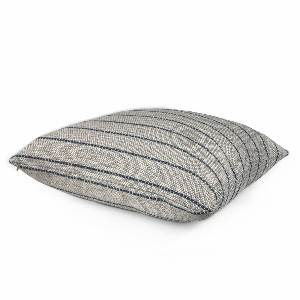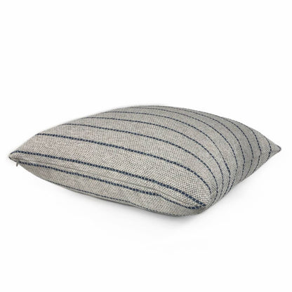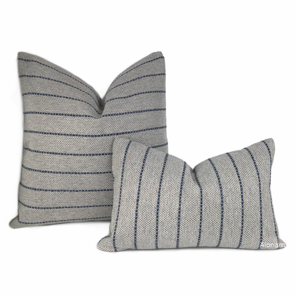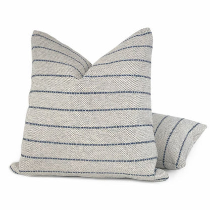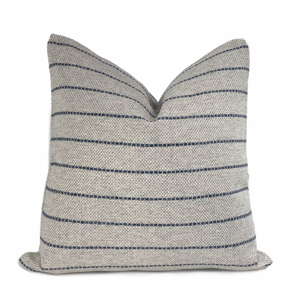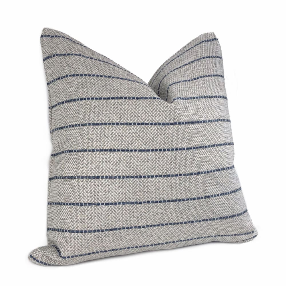 The Rockwell pillow cover features a thin blue stripe woven on a medium gray background. Simple but by no means plain, Rockwell is a fabulous addition to any contemporary, casual interior. Upholstery weight pattern fabric is used on both sides. Photographed on 20x20 and 12x18 inserts.