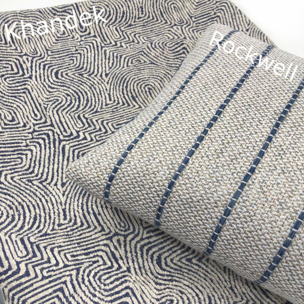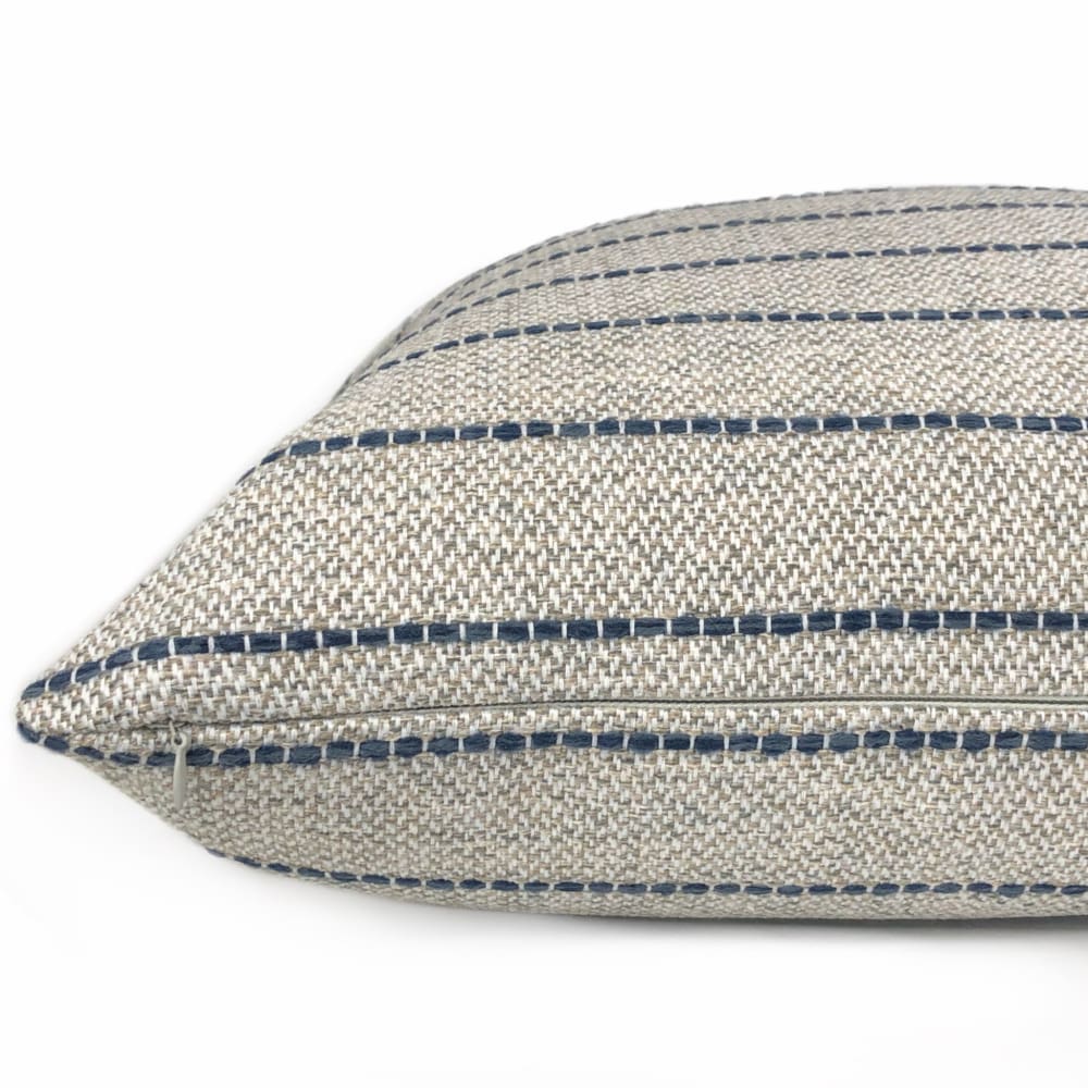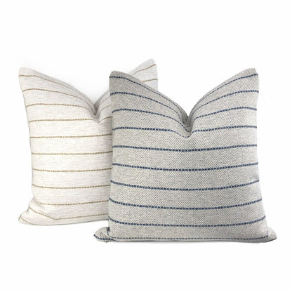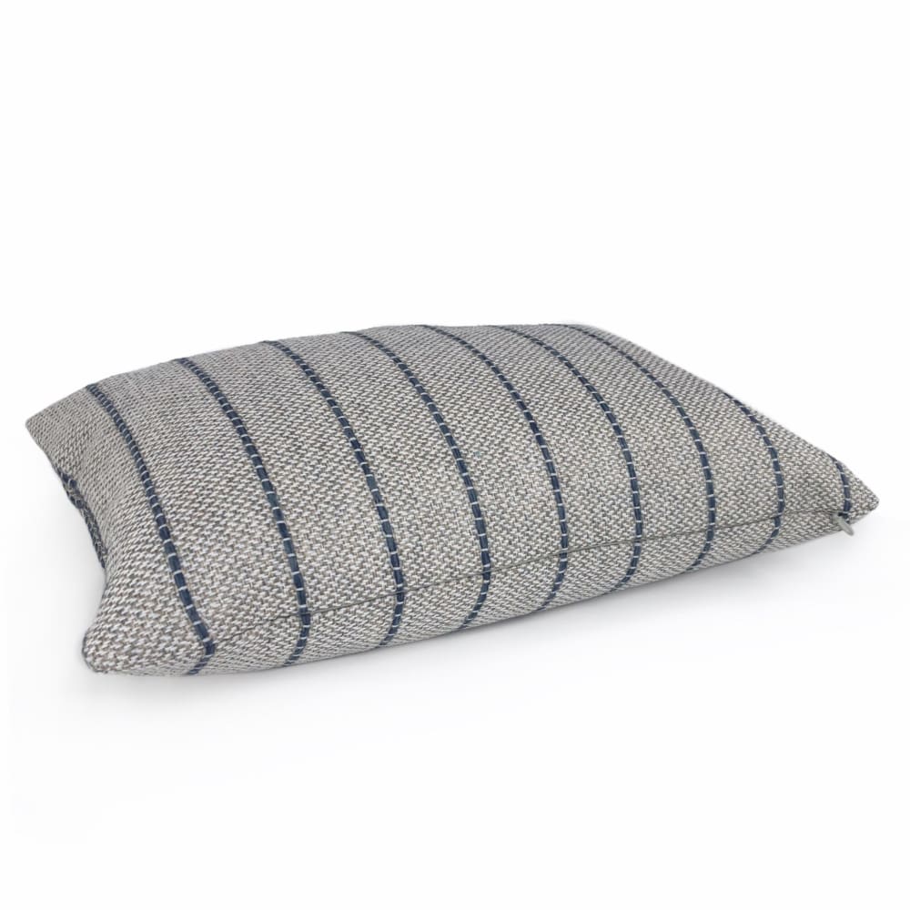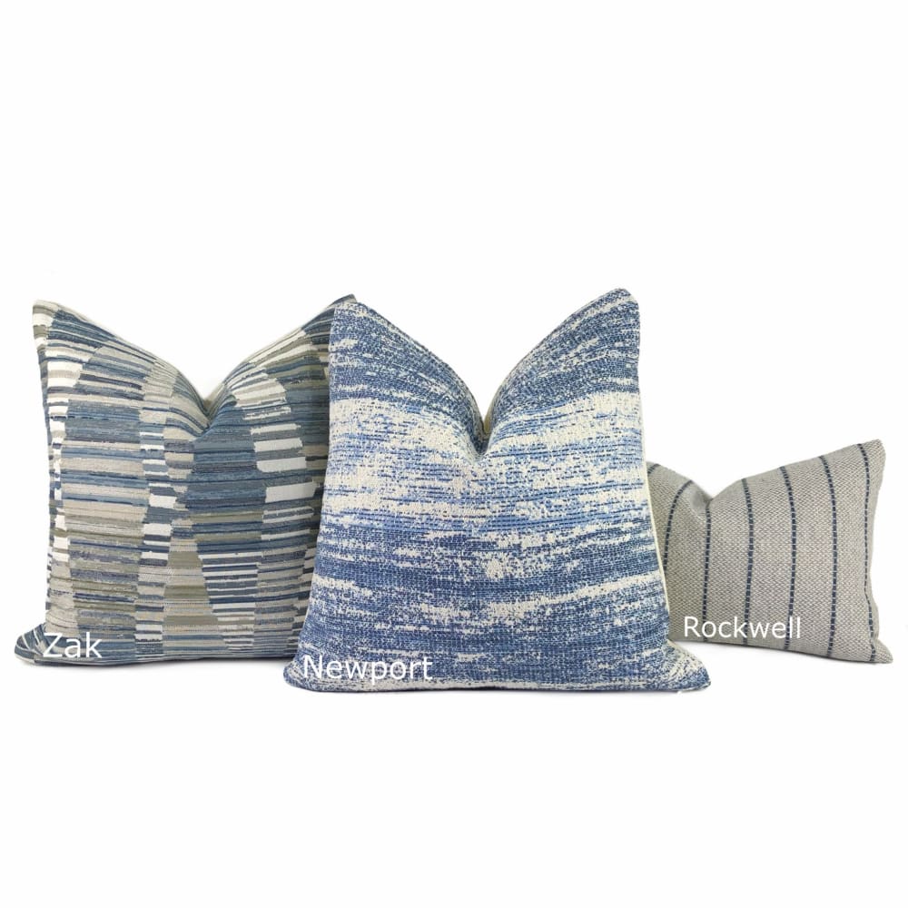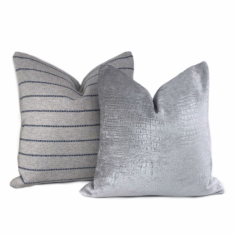 The Rockwell pillow cover features a thin blue stripe woven on a medium gray background. Simple but by no means plain, Rockwell is a fabulous addition to any contemporary, casual interior. Upholstery weight pattern fabric is used on both sides. Photographed on 20x20 and 12x18 inserts.