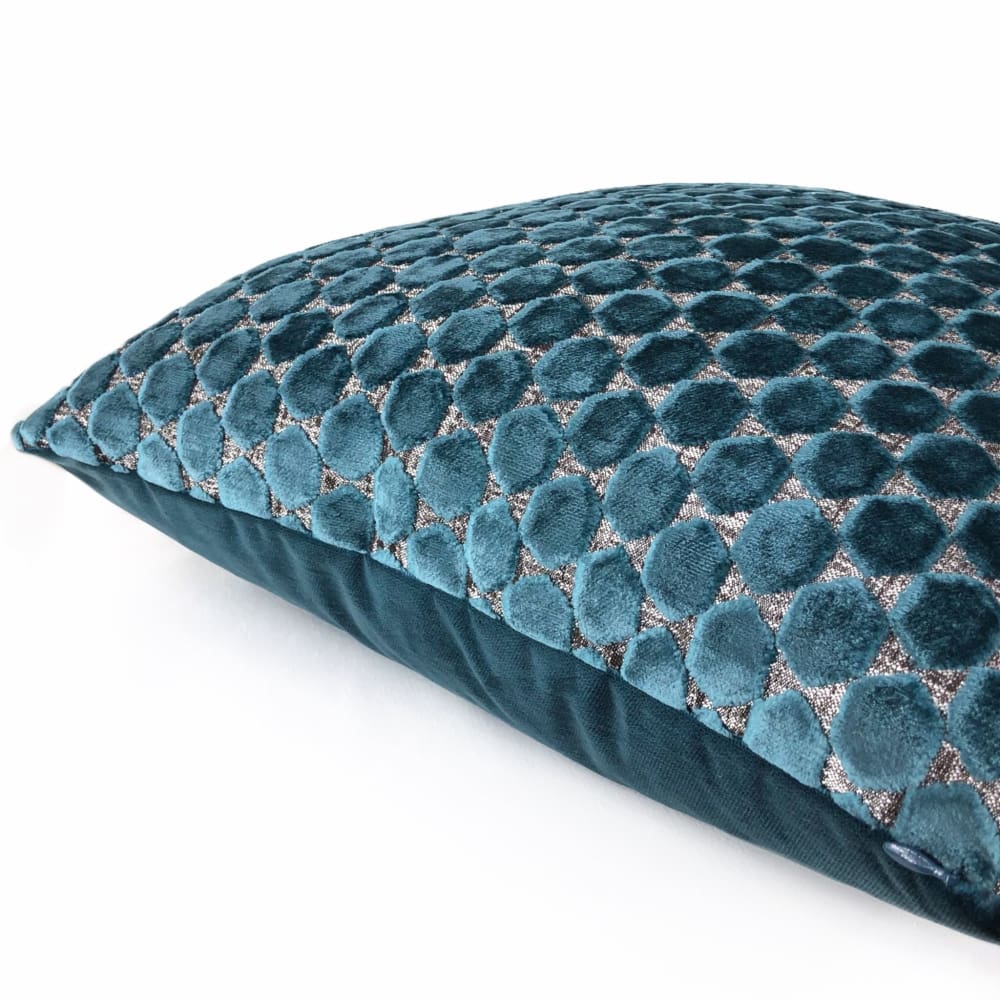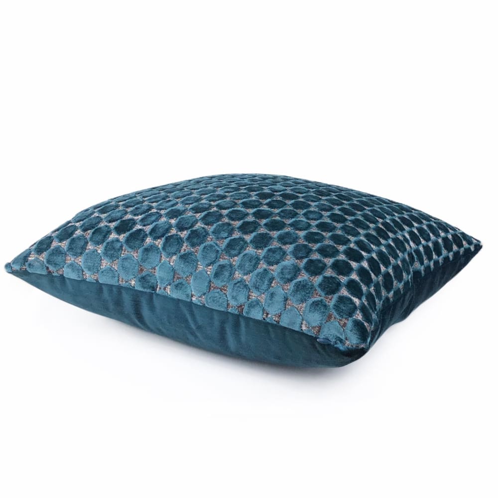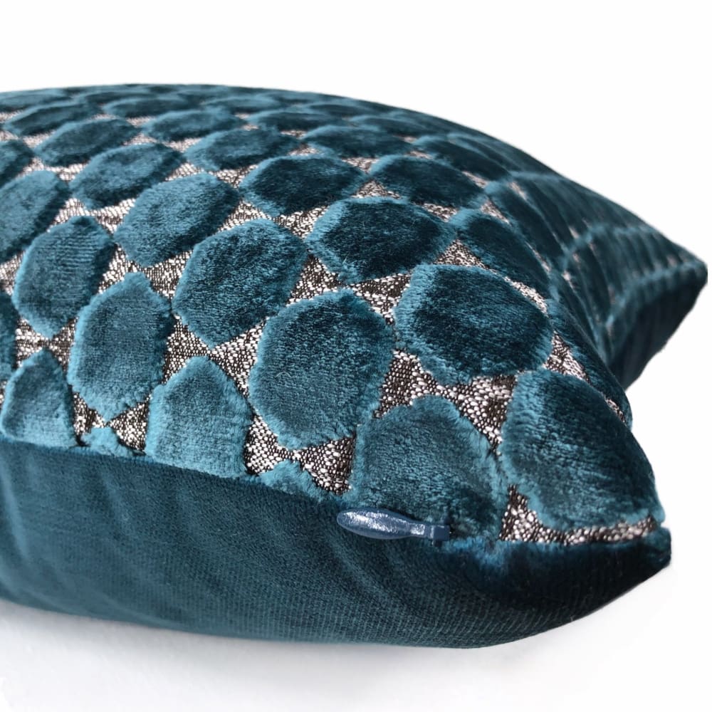 Almost sold out! The Orosi pillow cover is a triumph of sumptuous textures and color. Jewel like cut velvet hexagons in saturated viridian teal green shimmers against a dark silvery gray background. Designer pattern fabric is available to the trade only at over $200 a yard. Pattern front with coordinating solid teal velvet back. Photographed on 17x17 cover (filled with 18x18 insert).