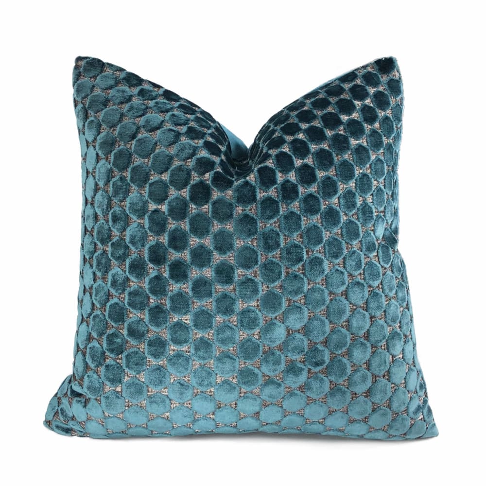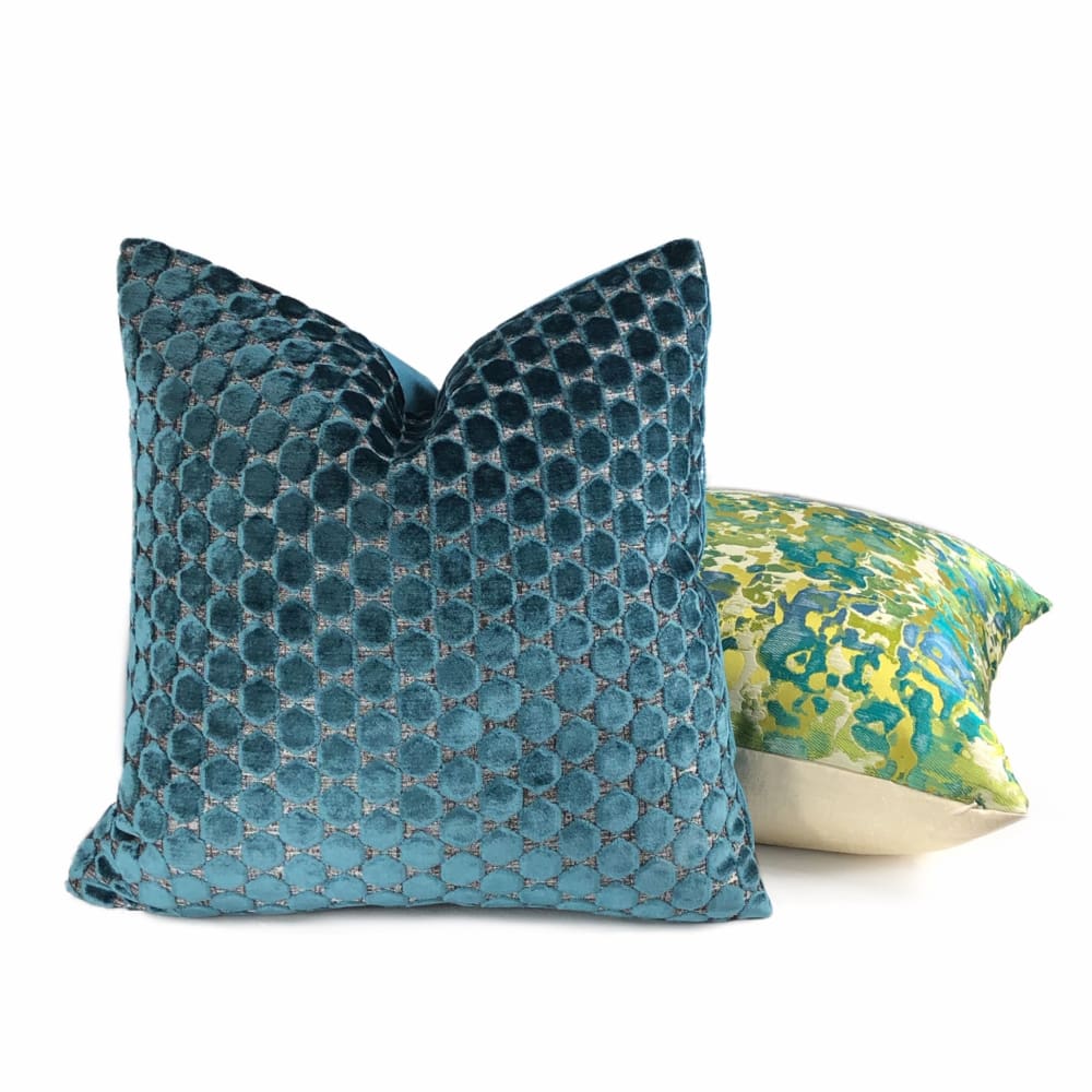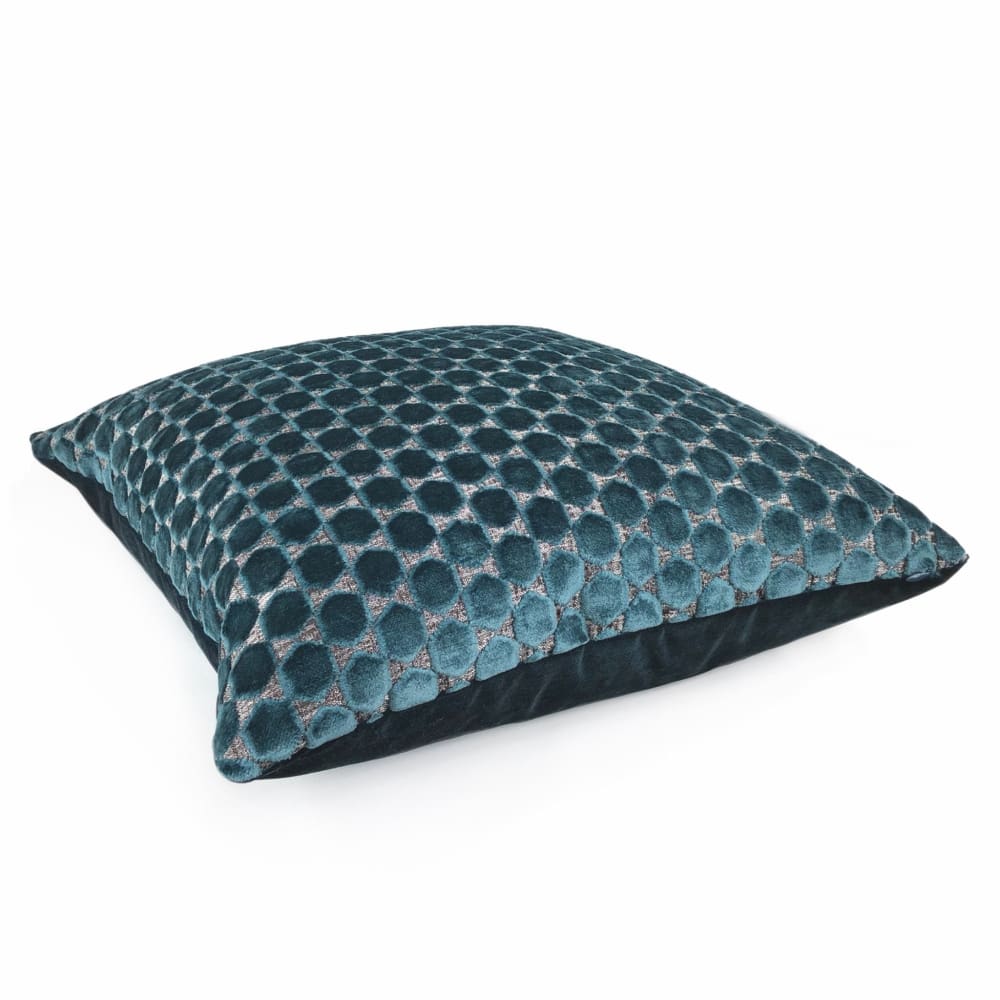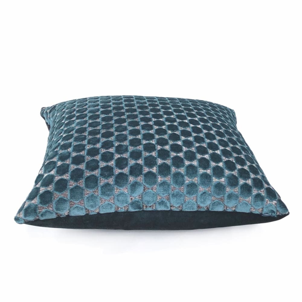 Almost sold out! The Orosi pillow cover is a triumph of sumptuous textures and color. Jewel like cut velvet hexagons in saturated viridian teal green shimmers against a dark silvery gray background. Designer pattern fabric is available to the trade only at over $200 a yard. Pattern front with coordinating solid teal velvet back. Photographed on 17x17 cover (filled with 18x18 insert).