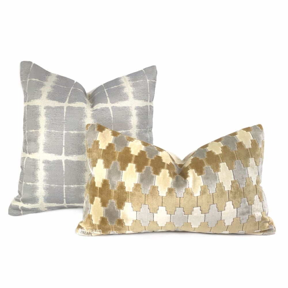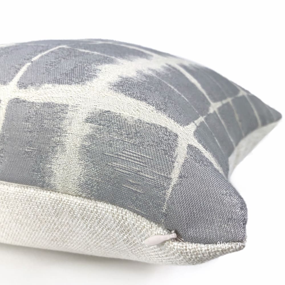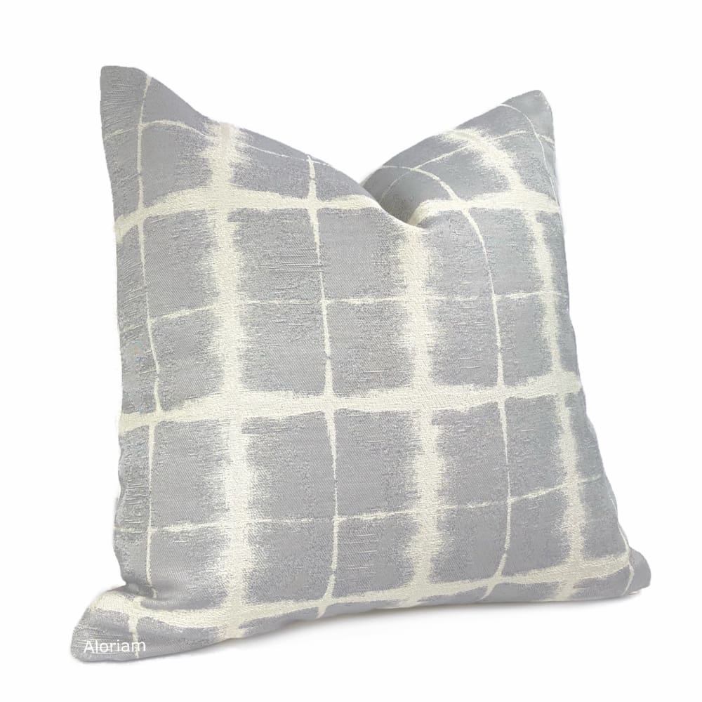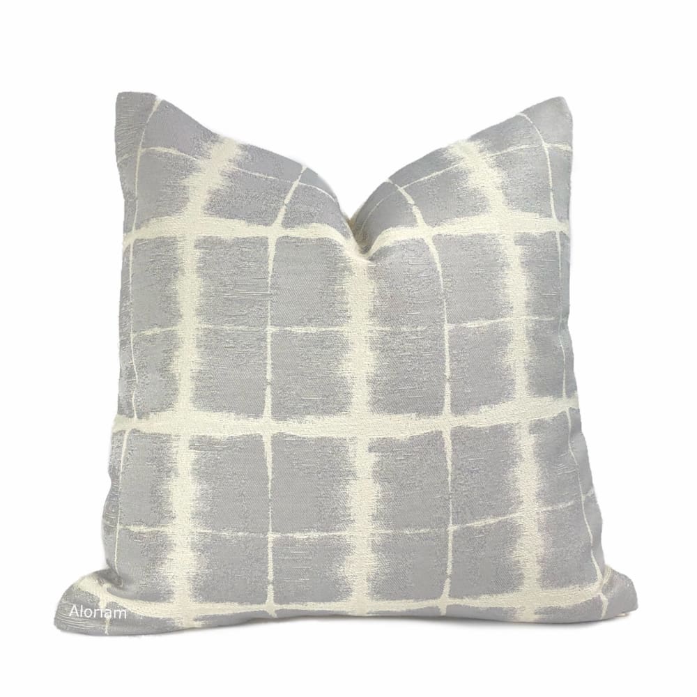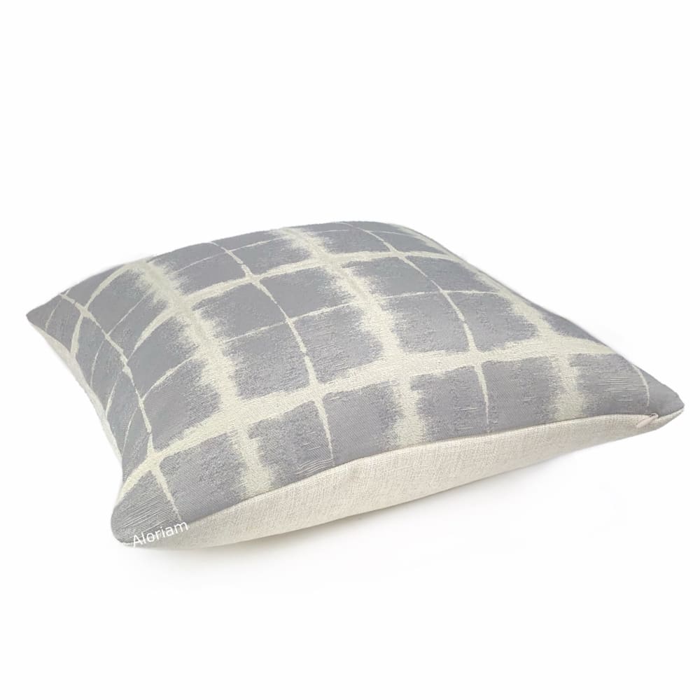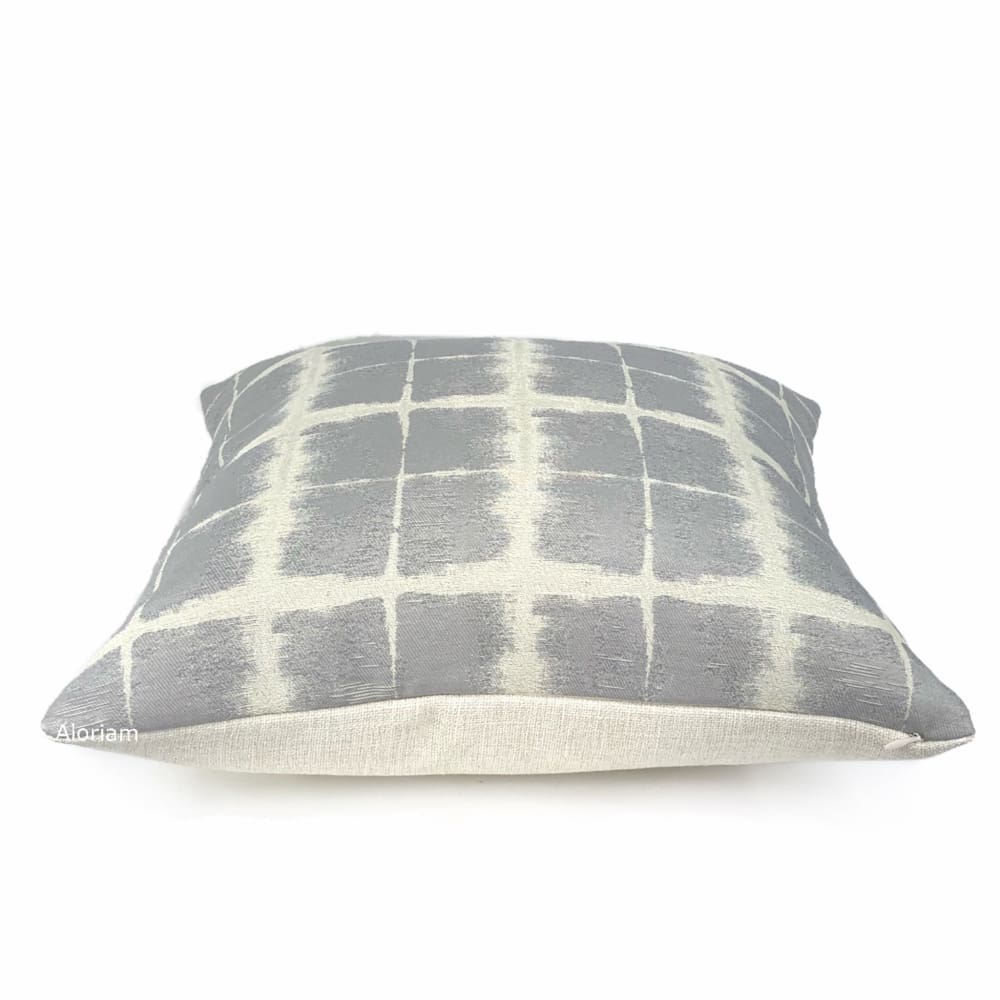 Rutherford is a limited edition pillow cover featuring plaid check pattern woven in light gray and cream. Offered with a coordinating solid cream backside. Photographed on 17x17 cover (filled with 18x18 insert).