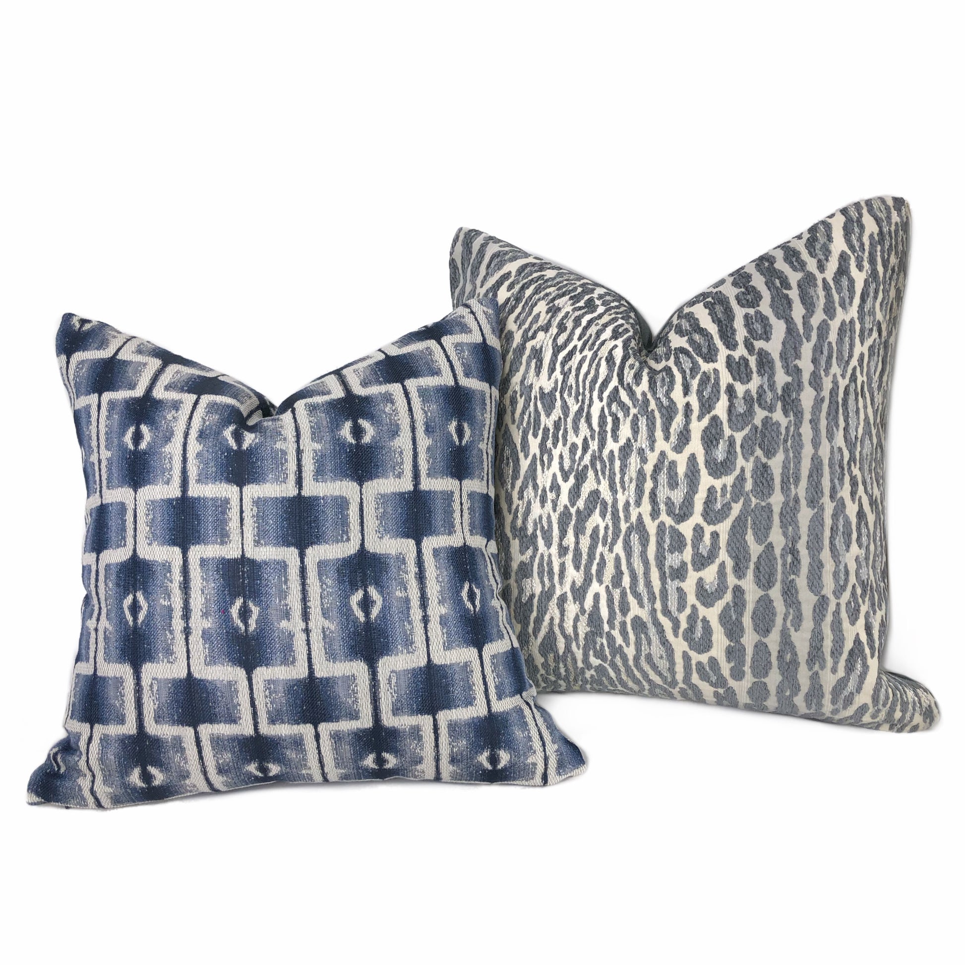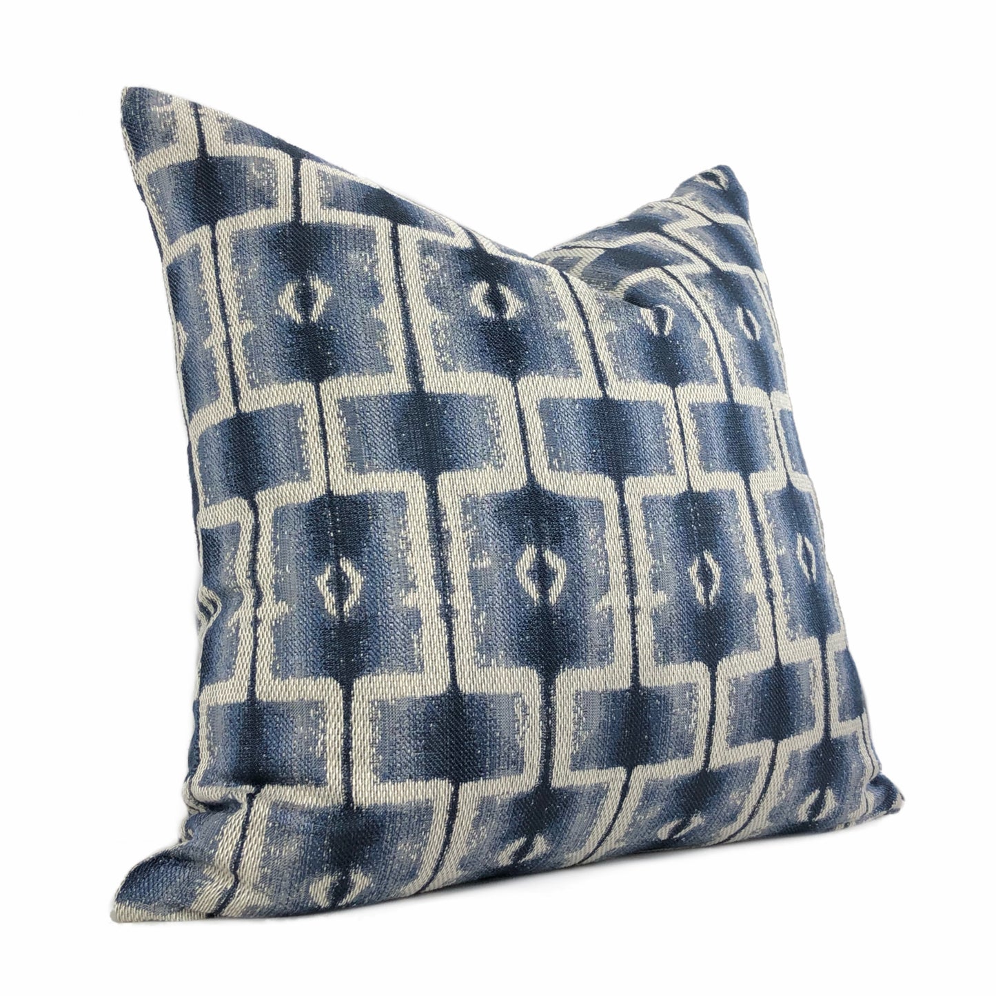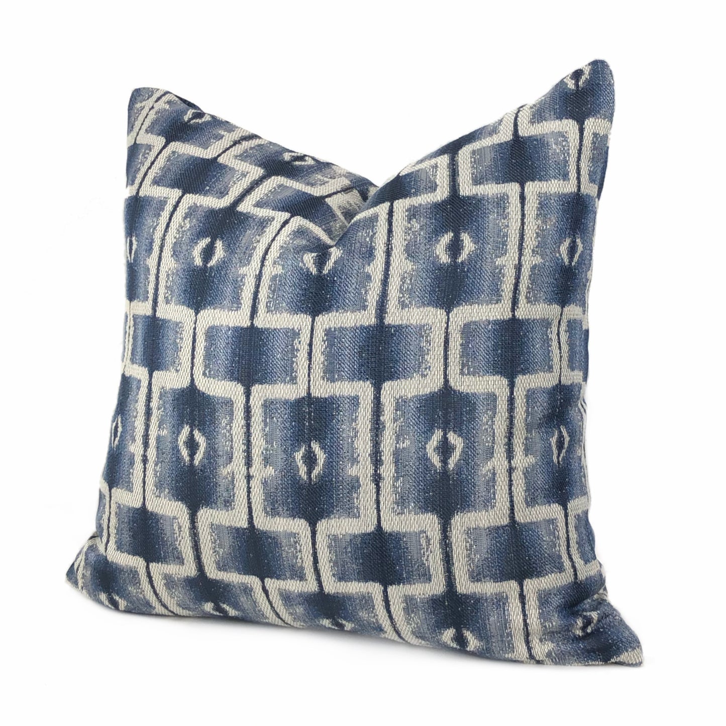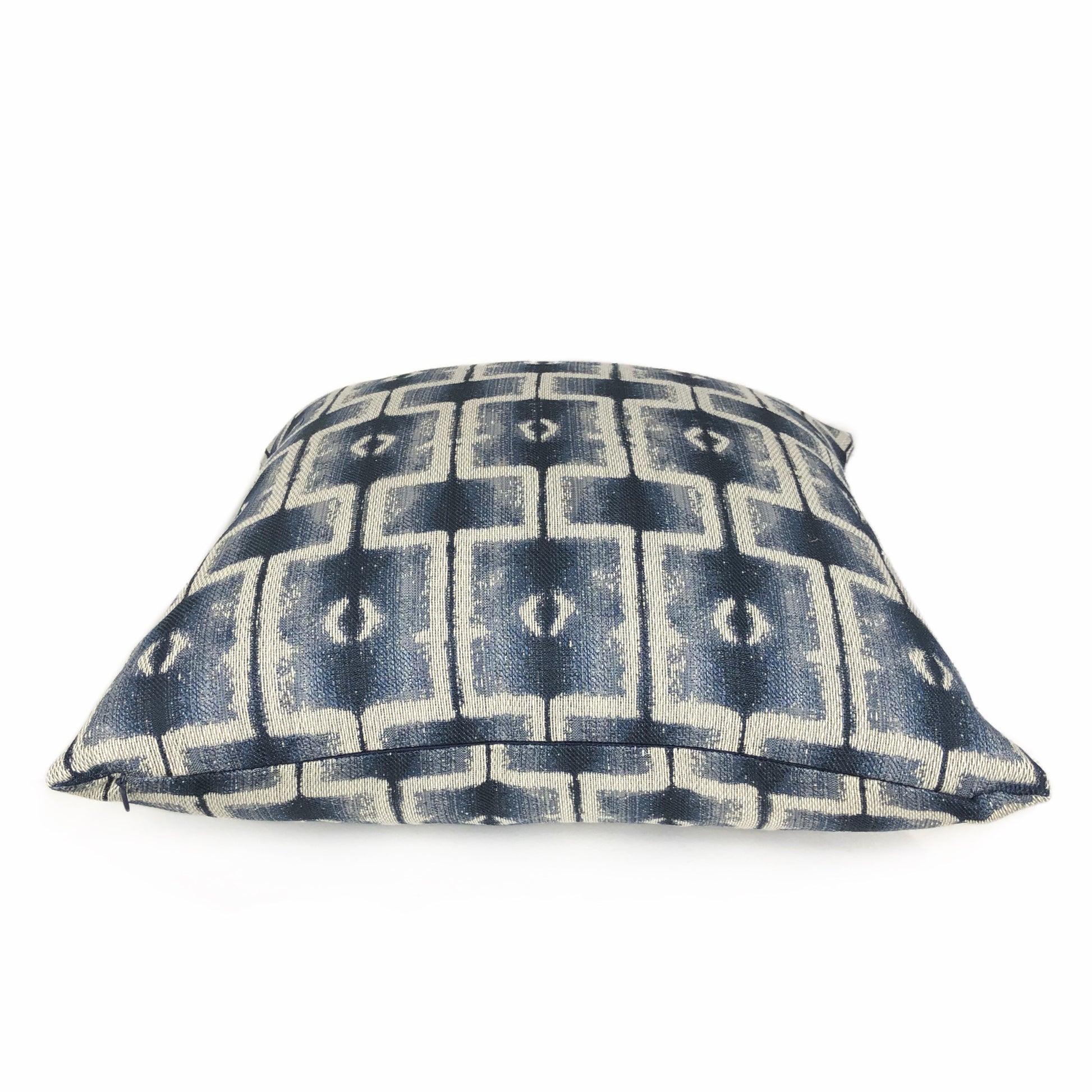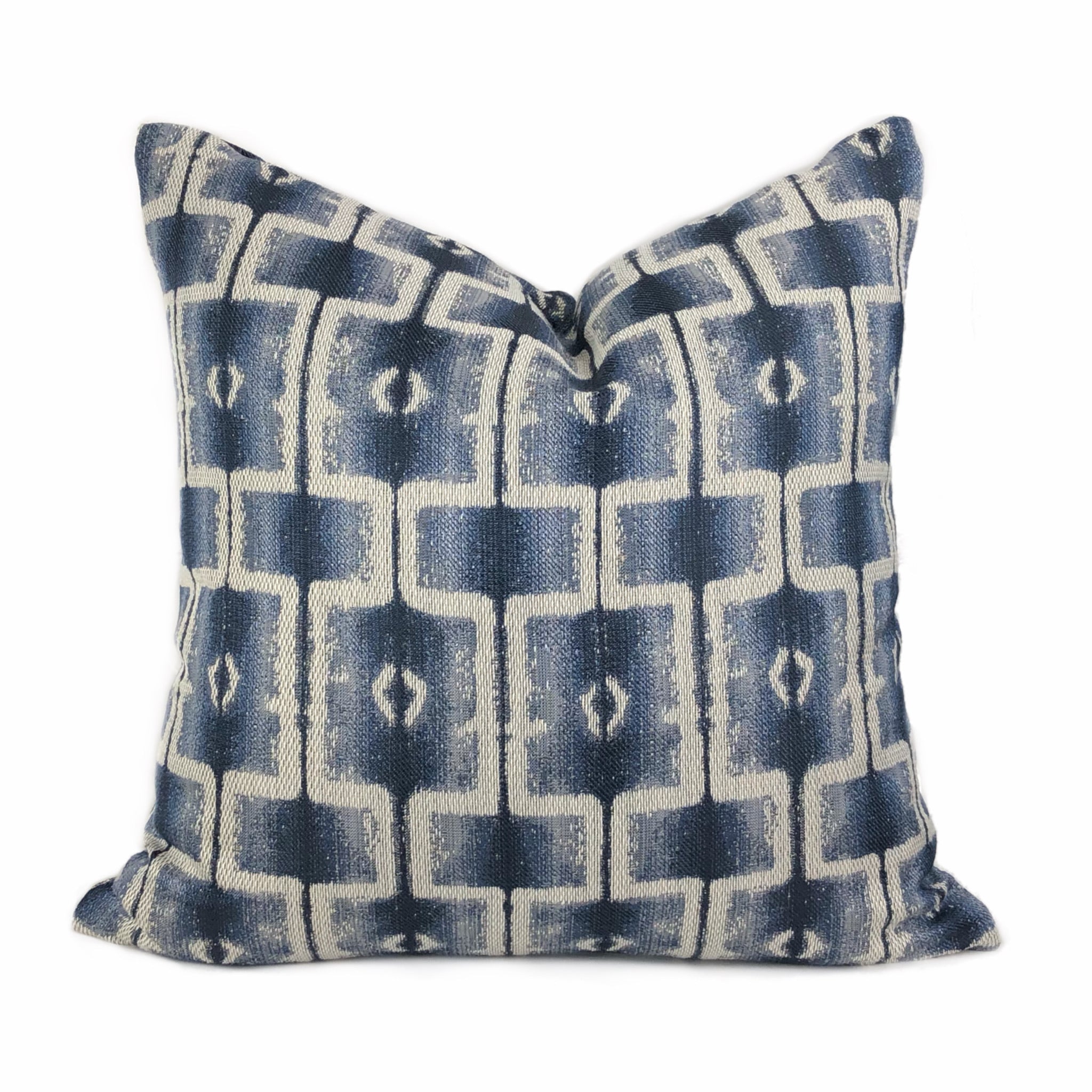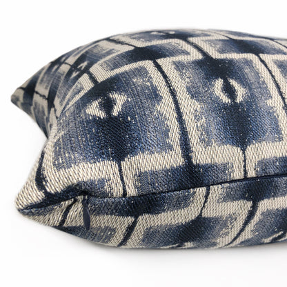 Saati is a gray and blue pillow cover woven with an ethnically inspired geometric block design. Photographed on 17x17 cover (filled with 18x18 insert).