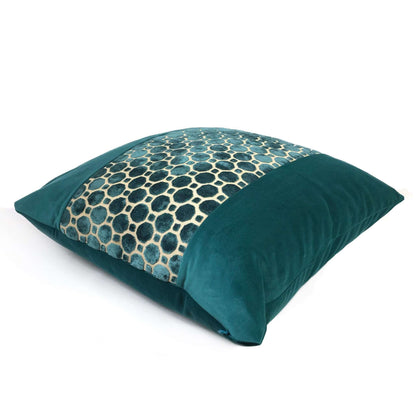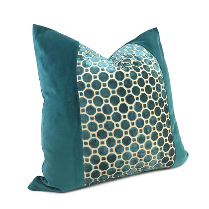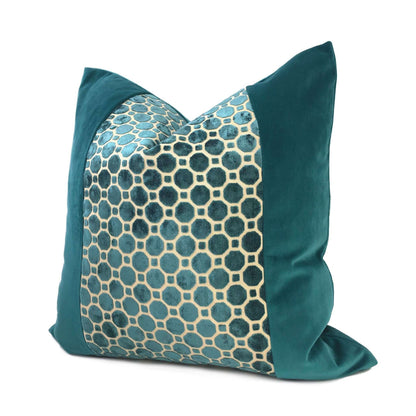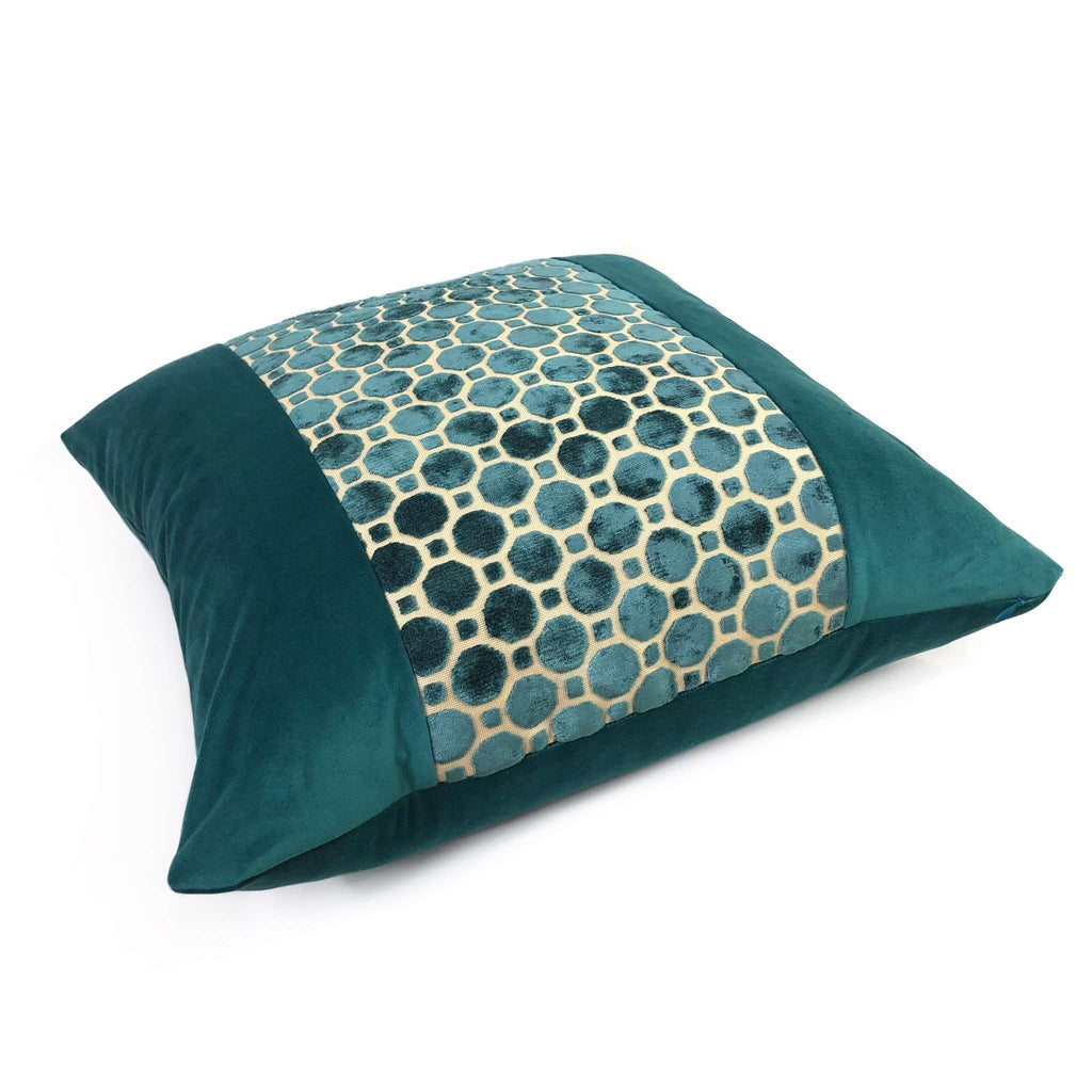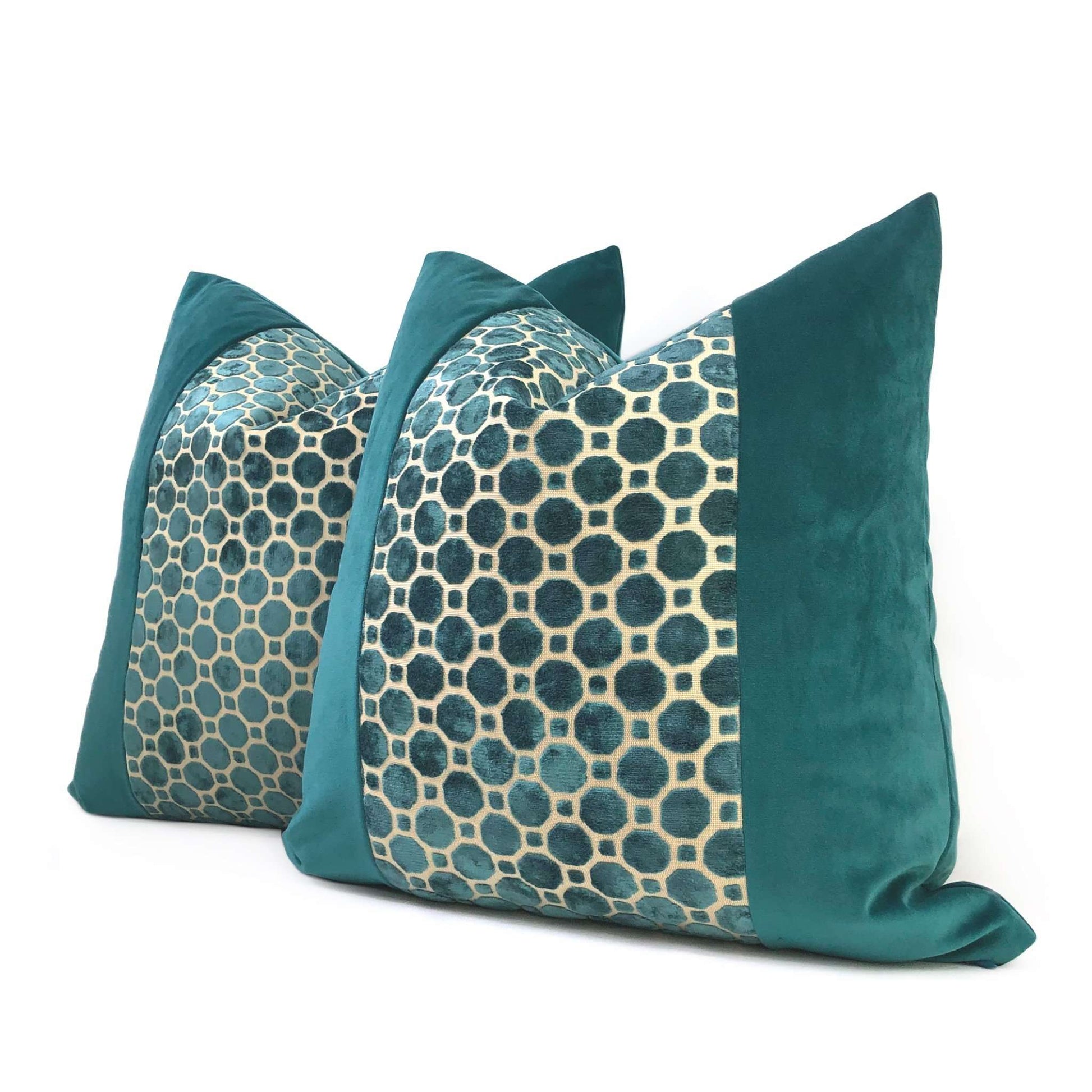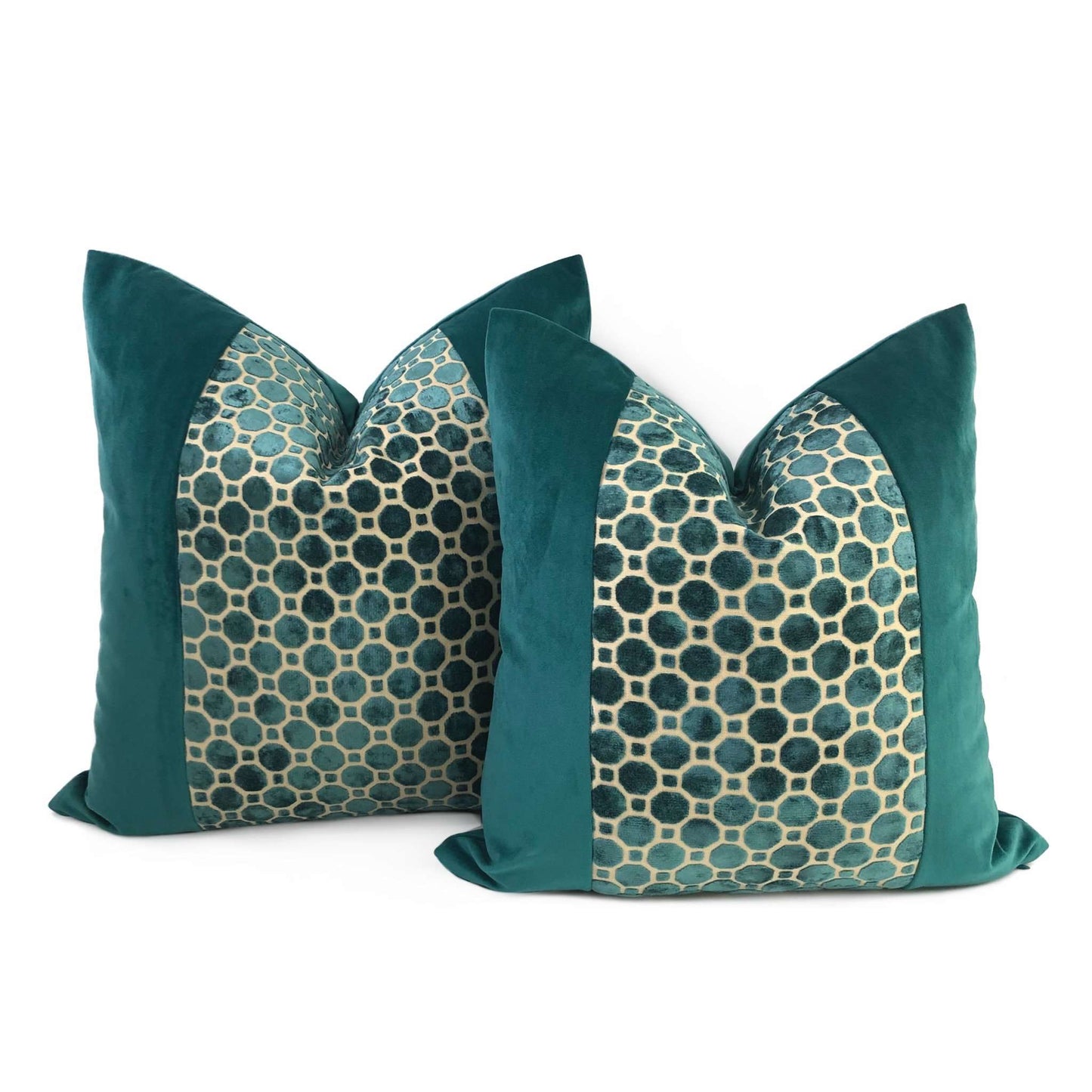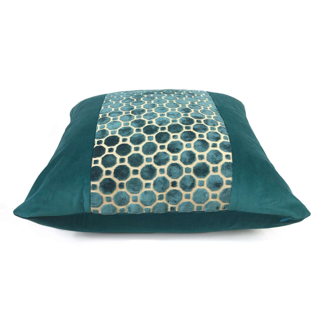 LAST TWO! A jewel-like panel of teal green velvet hexagons, offset against a solid teal velvet on either side, creates this elegant and luxurious pillow design that will elevate the style of any home interior. This pillow cover reverses over to a matching solid teal green velvet backside. Photographed on 20x20 and 24x24 inserts.