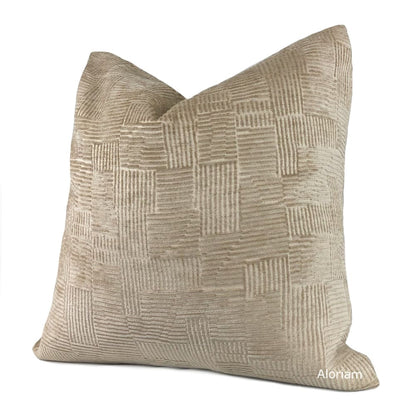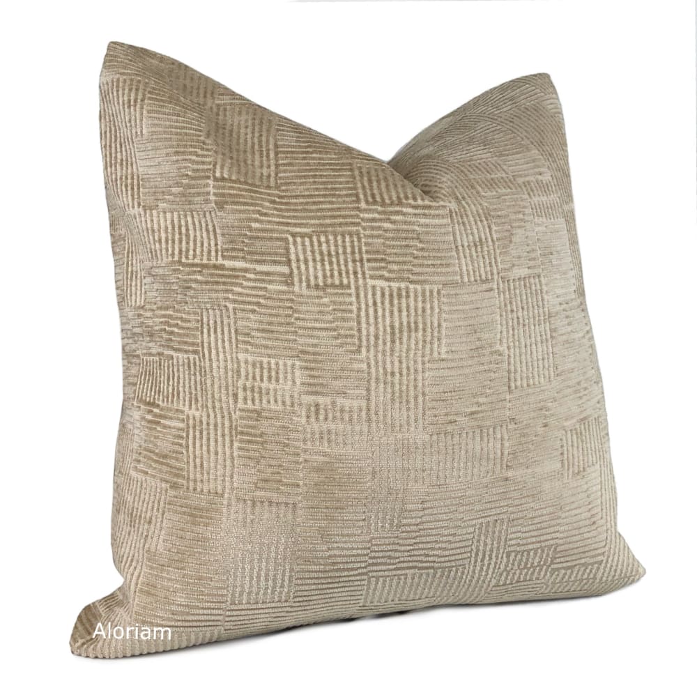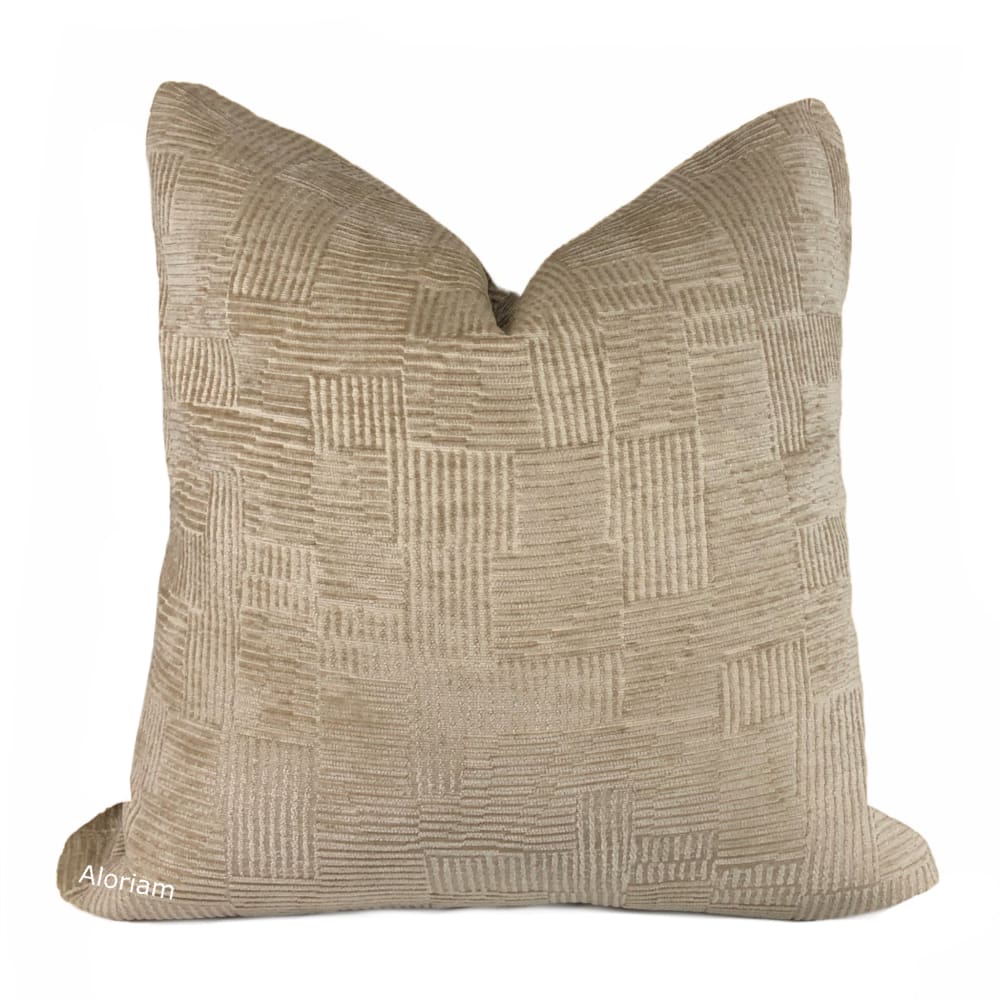 The Samuel pillow cover features the cozy hand of a plush textured chenille and a contemporary cross hatch design in a gorgeous neutral color of driftwood brown.
