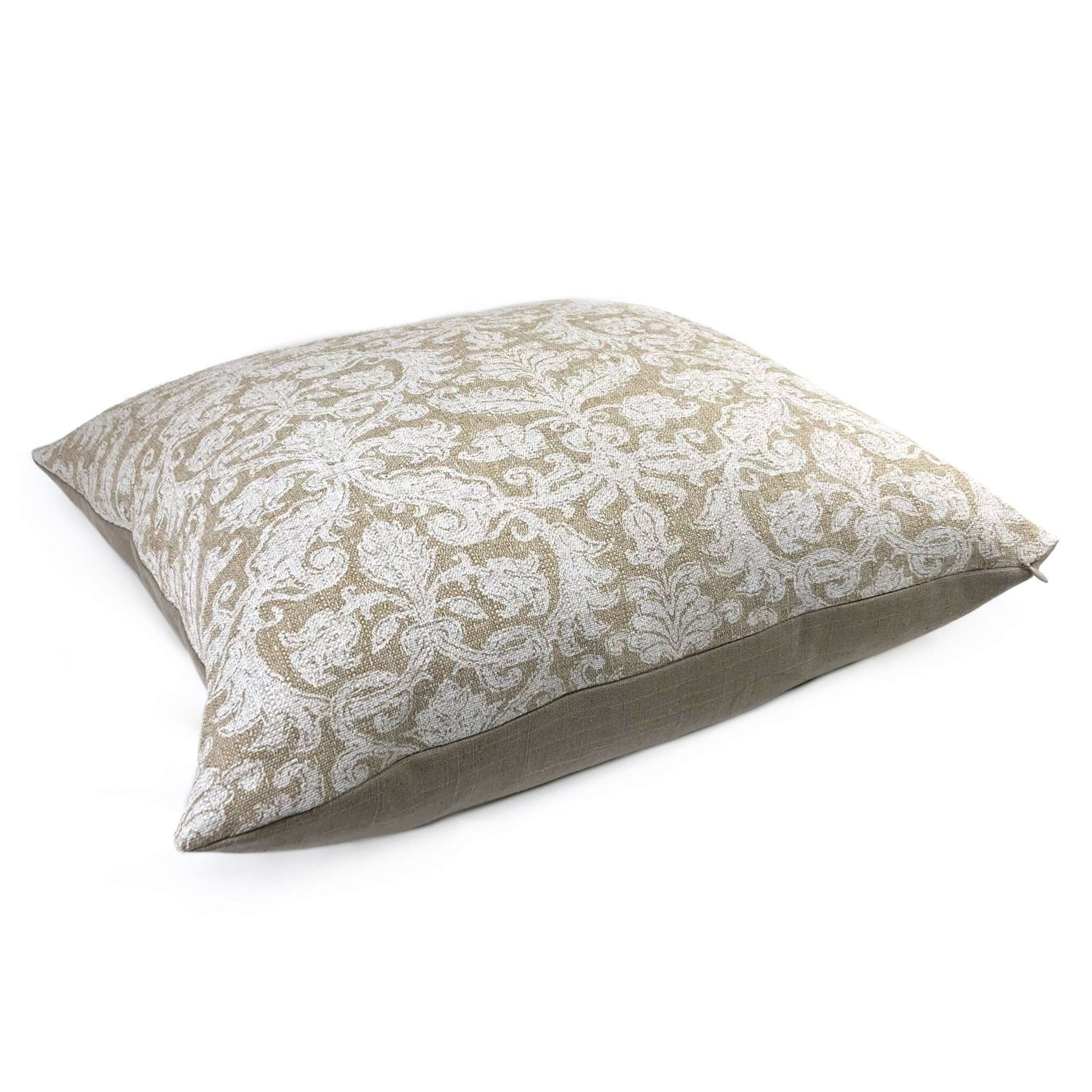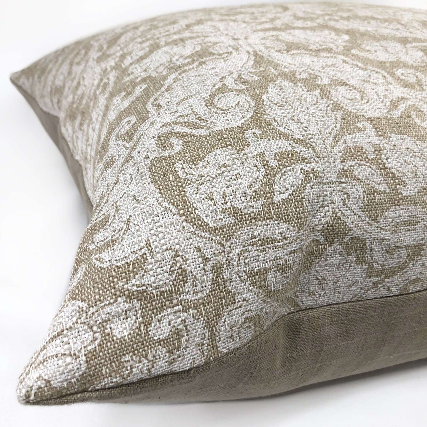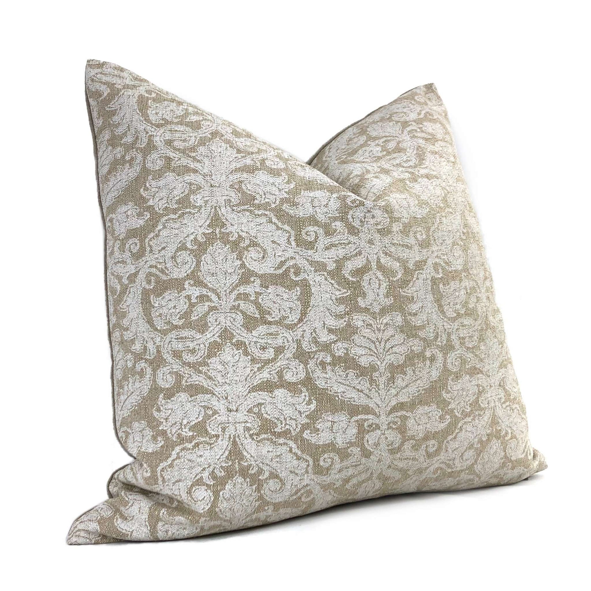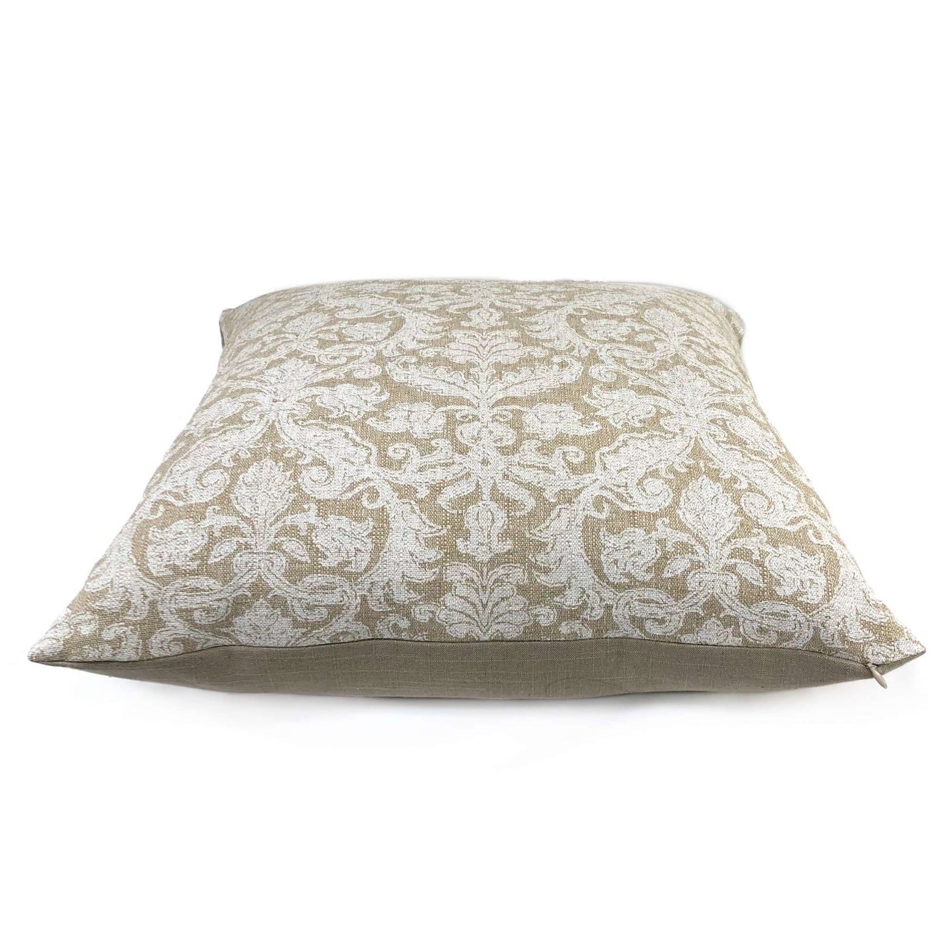 This damask floral pillow cover is made from a Lacefield Designs fabric printed in chalk white on a beige woven background. This casual, yet elegant, damask pattern mixes well with many other Lacefield Designs pillows -- check out our collection here!