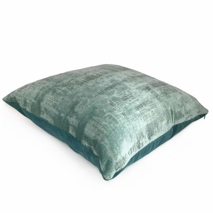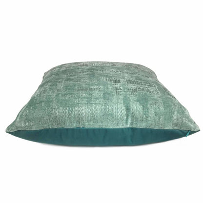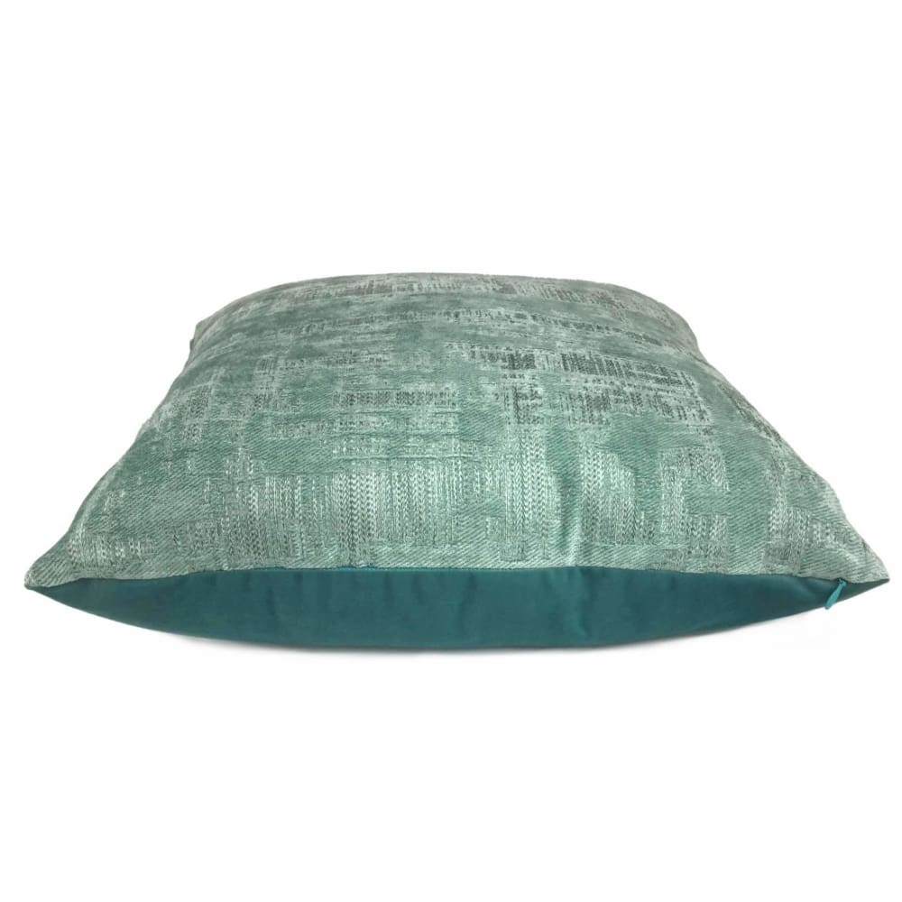 This seafoam green pillow cover features a textured abstract pattern that will look fabulous in any modern, casual decor. Choose from the designer pattern fabric used on both sides or on the front side reversing to a coordinating solid seafoam green velvet fabric. Photographed on 20"x20" insert.