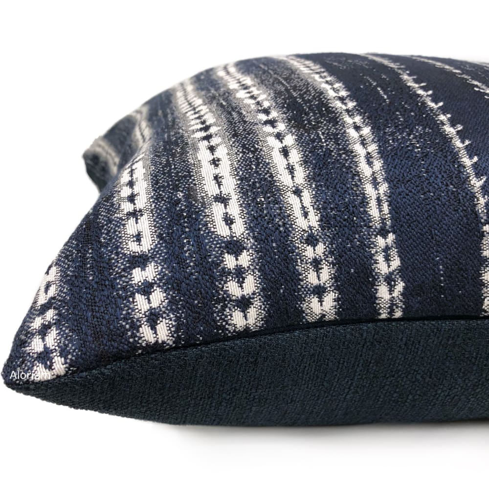 Sebu is an ikat stripe pillow cover woven in dark navy and white.