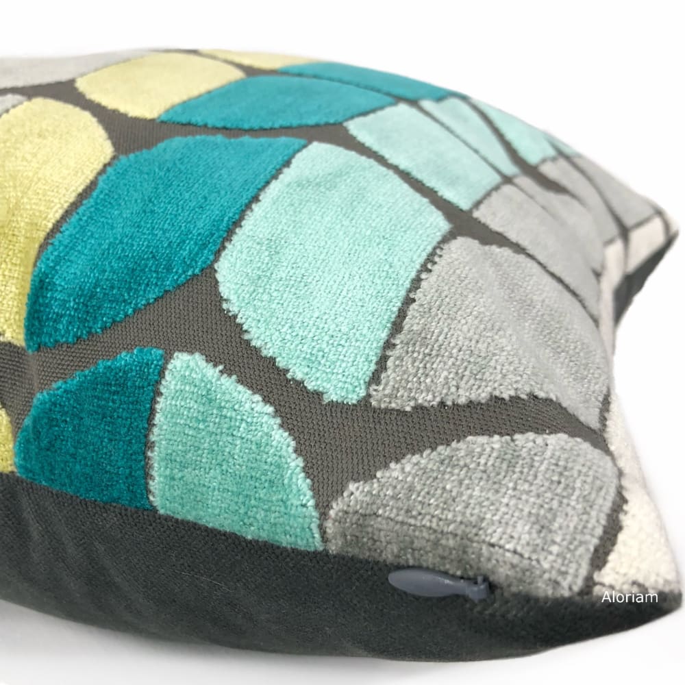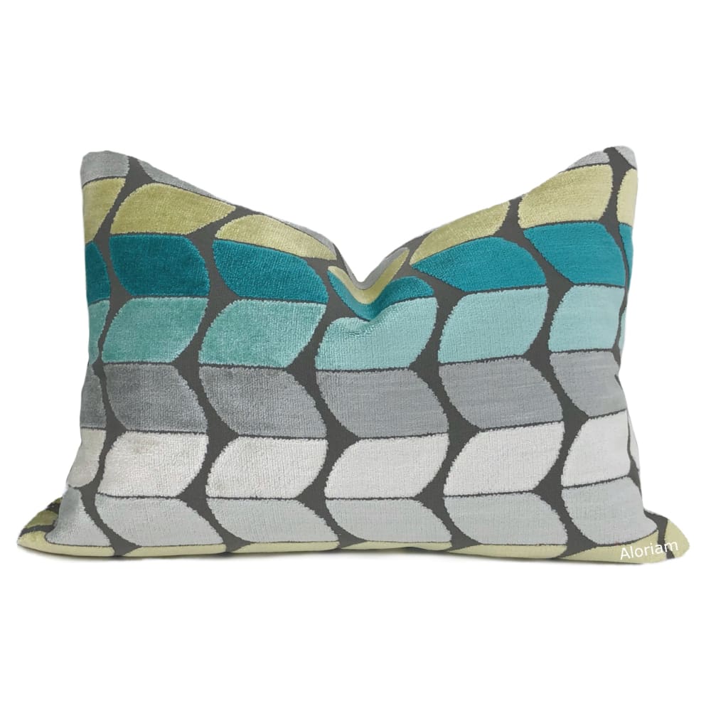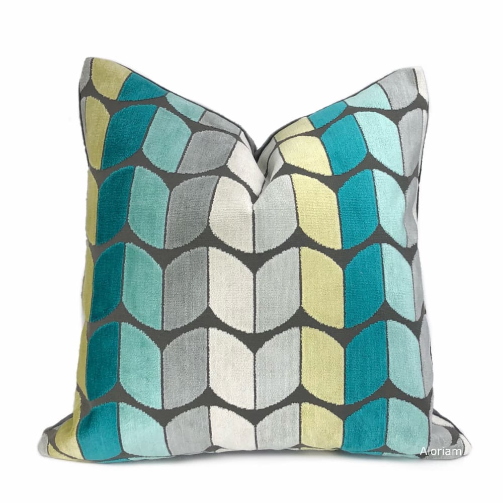 Sheridan Aqua Teal Green Yellow Gray Velvet Pillow Cover (FROM IN STOCK FABRIC)