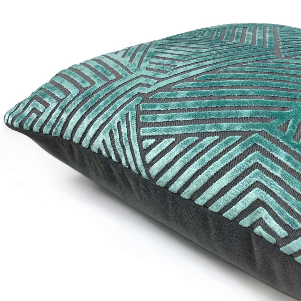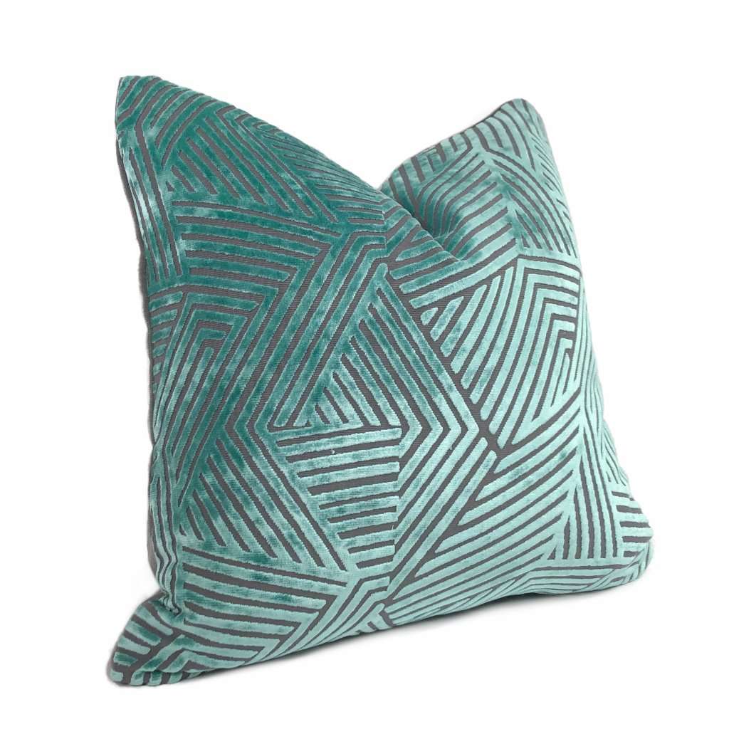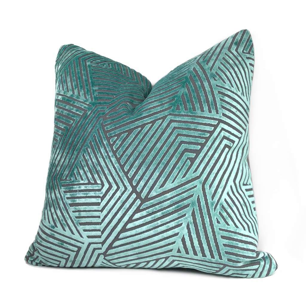 (CLEARANCE) Soho Aquamarine & Gray Cut Velvet Geometric Lines Pillow Cover