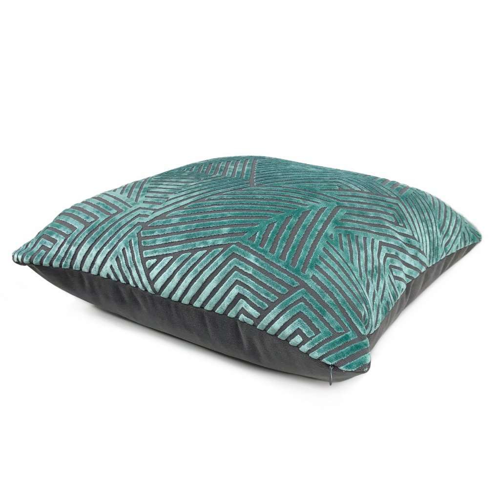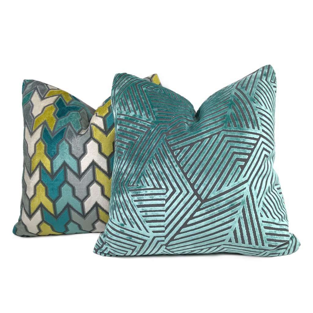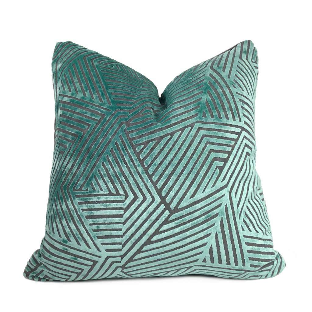 (CLEARANCE) Soho Aquamarine & Gray Cut Velvet Geometric Lines Pillow Cover