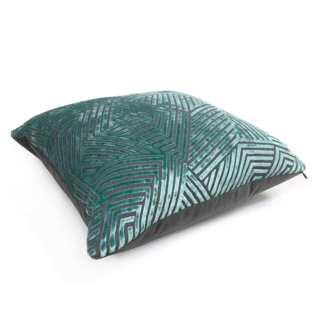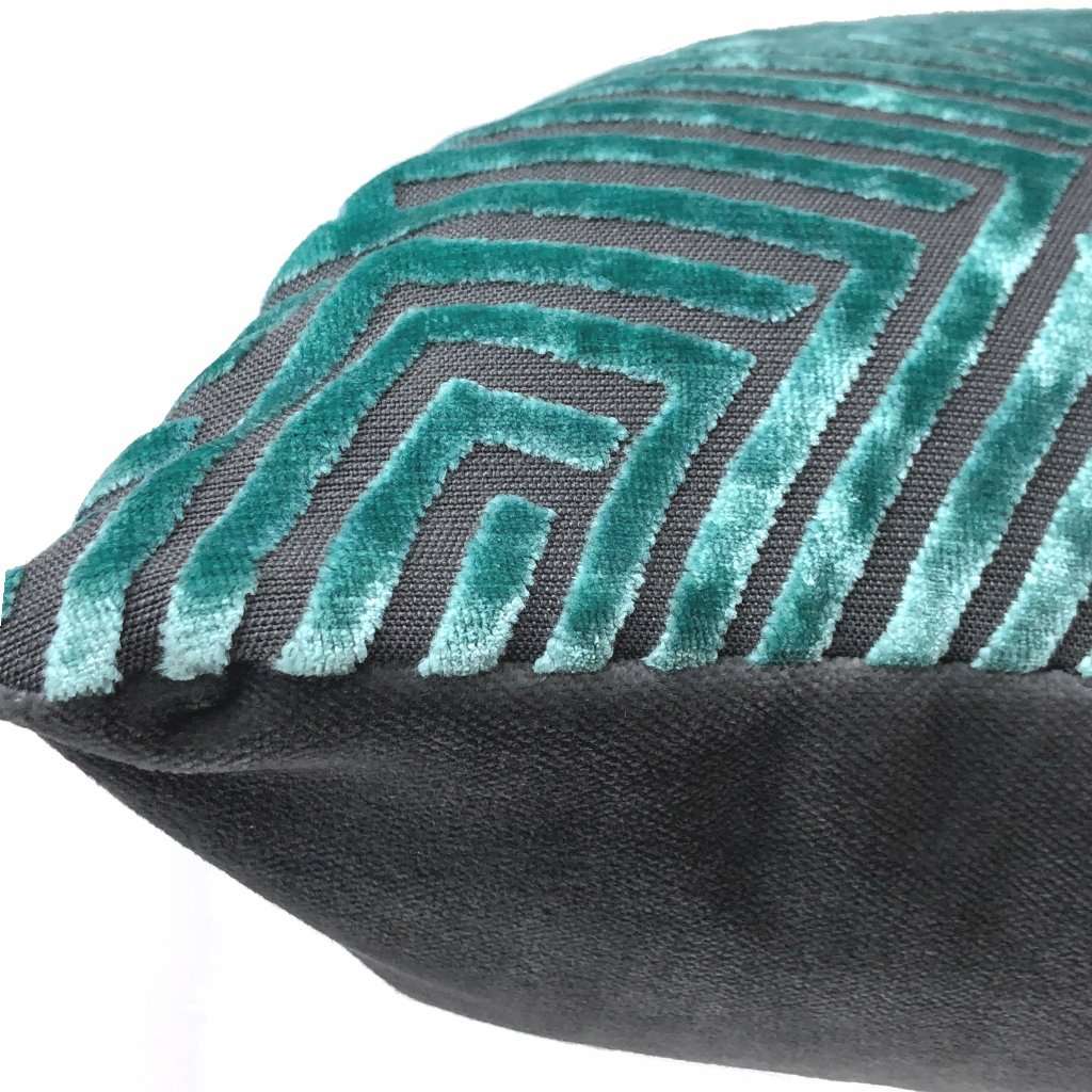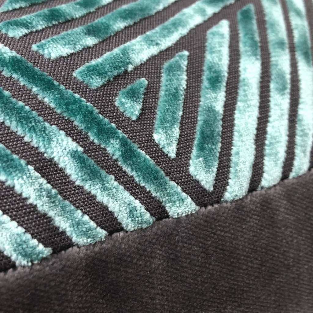 If our Soho pillow isn’t the jolt to revive a flatlined home interior, we don’t know what is! This soft velvet pillow cover is woven in a luminous aquamarine blue-green against a dark gray backdrop. Your choice of the pattern fabric used on both sides or with a solid gray velvet backside. Photographed on 19x19 cover (filled with 20x20 insert).