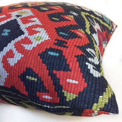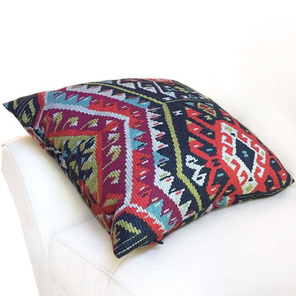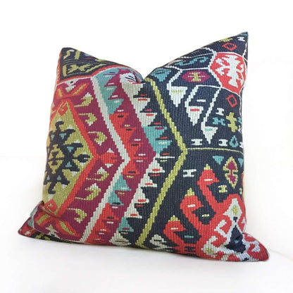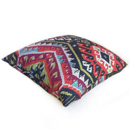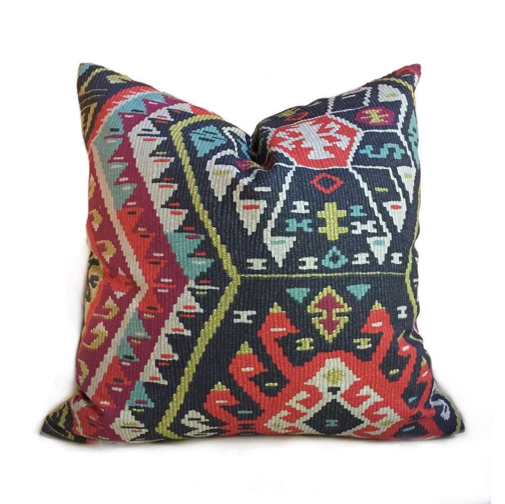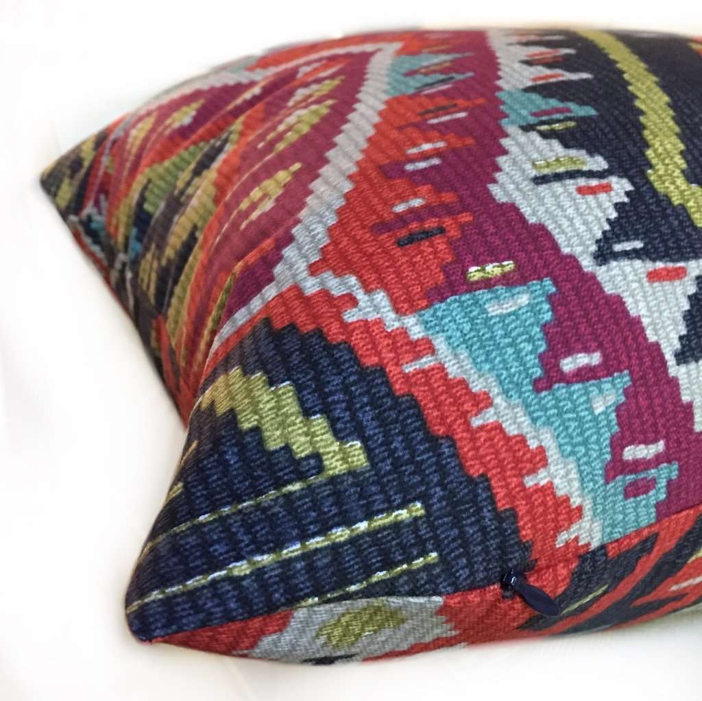 This southwest / ikat / ethnic style cotton print pillow cover will add a blast of colorful style to any space! Red, turquoise, magenta, lime green combine on a dark charcoal gray background. Photographed on 20.5x20.5 cover (filled with 22x22 insert).