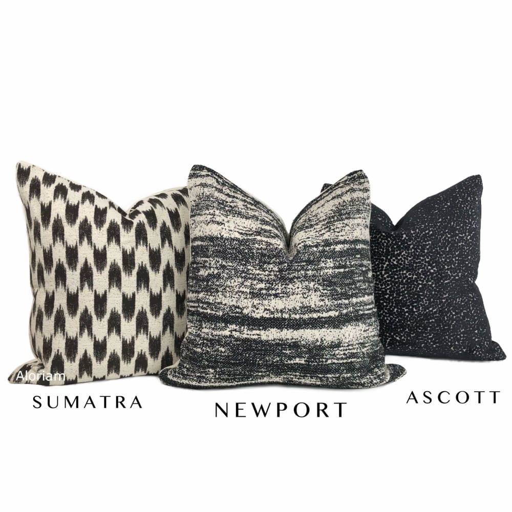 The Sumatra pillow cover features an ikat-style arrow pattern woven in black on a cream background.