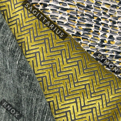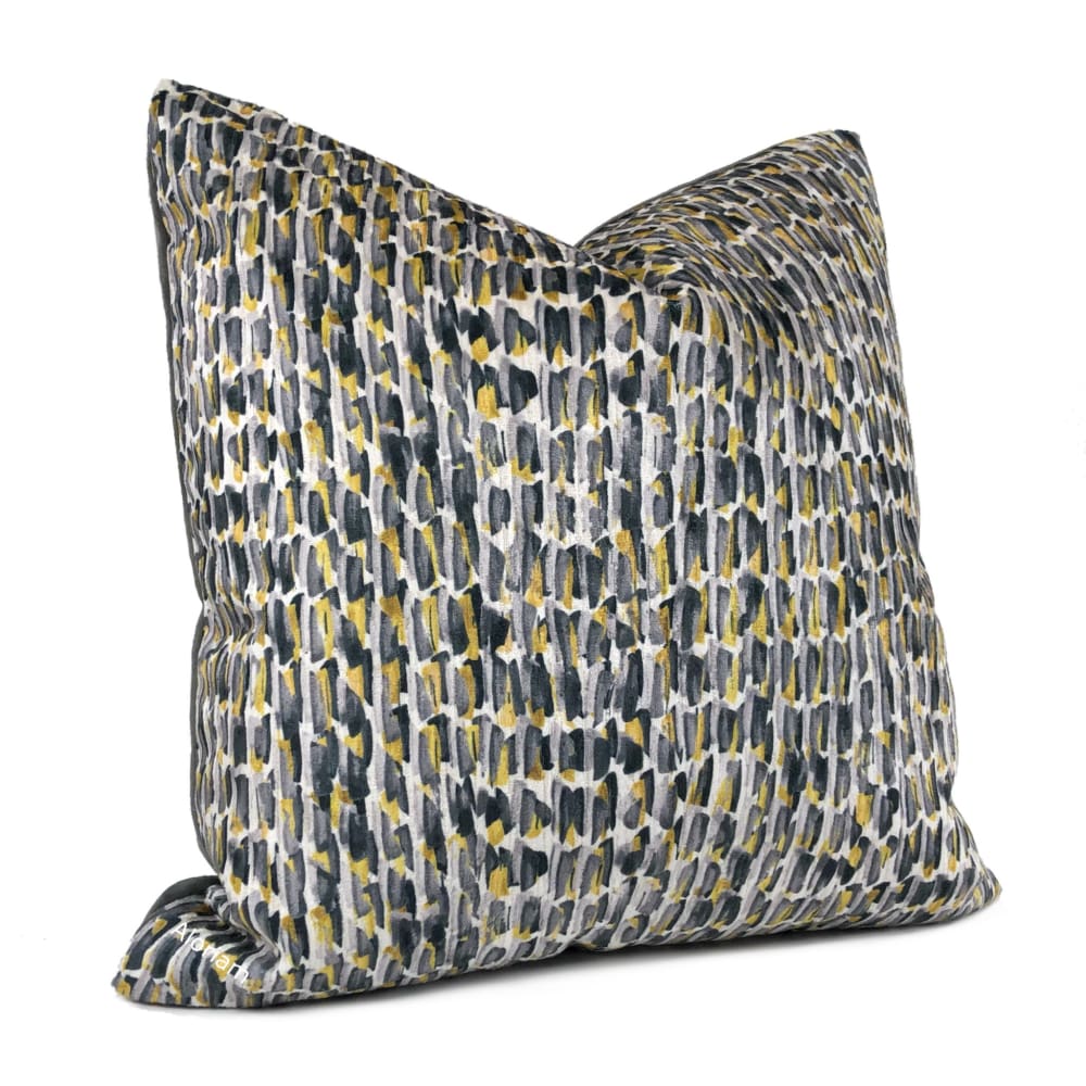 Symon is a modern pillow cover with an abstract paint dab pattern in gray tones with golden yellow accents.