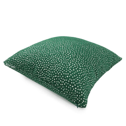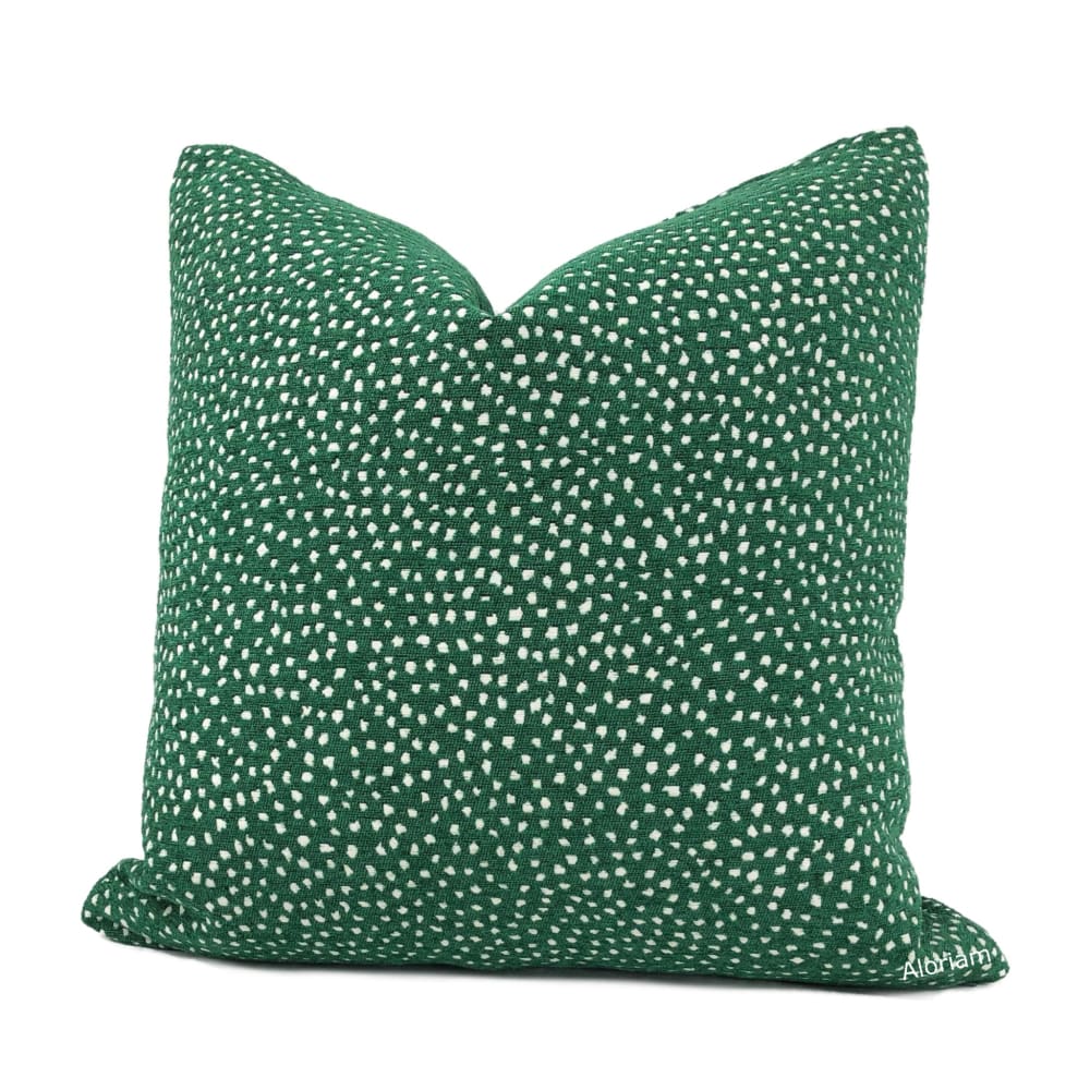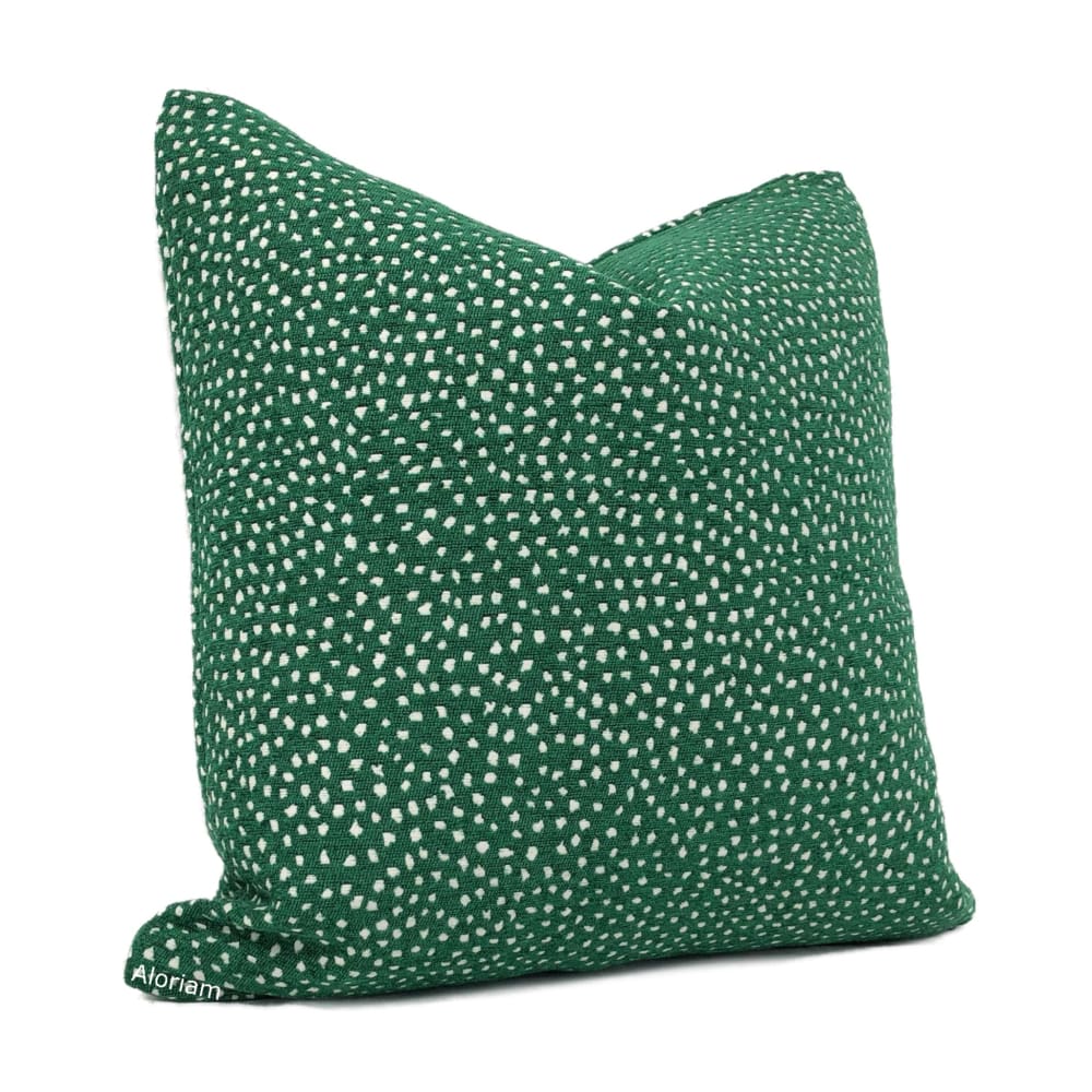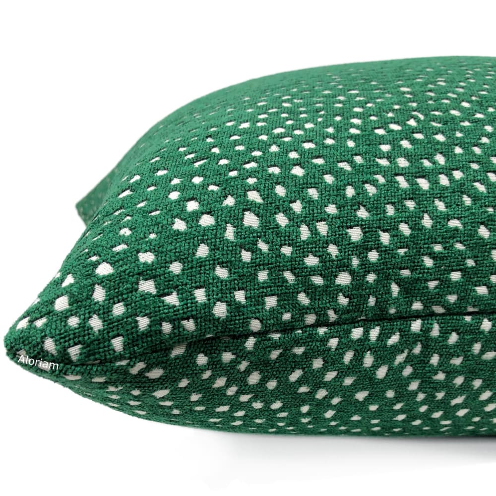 Taylor is a soft chenille pillow cover featuring small white dots woven on an emerald green background. Fantastic with a variety of other designs! Pattern fabric on both sides. Photographed on 17x17 cover (filled with 18x18 insert).