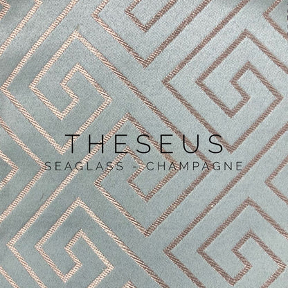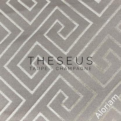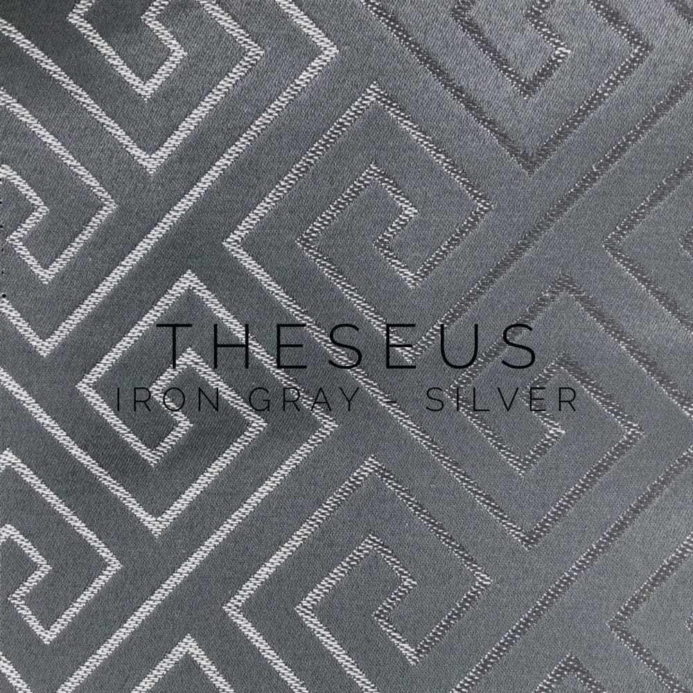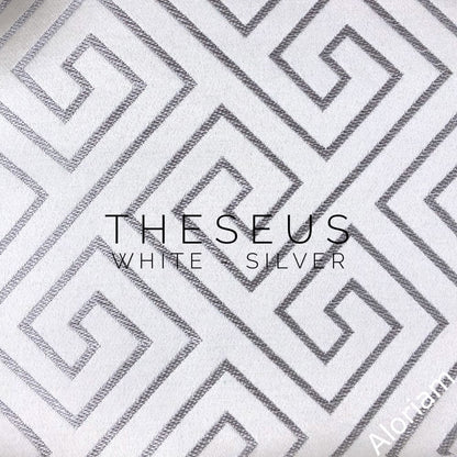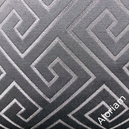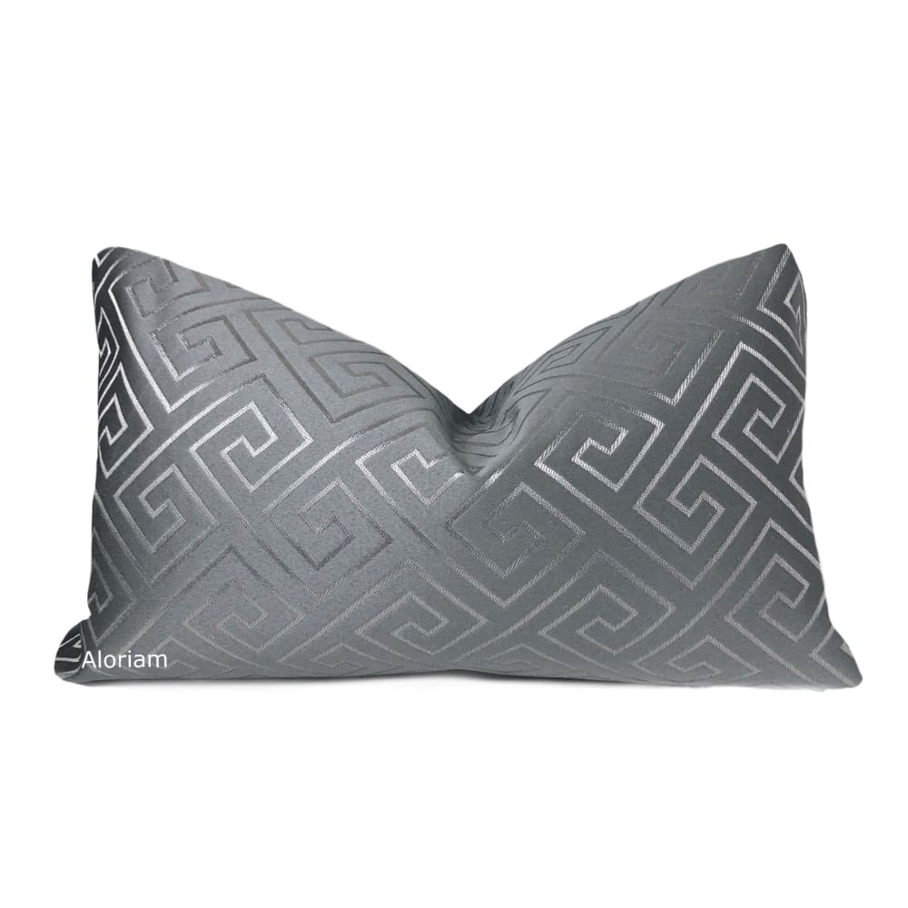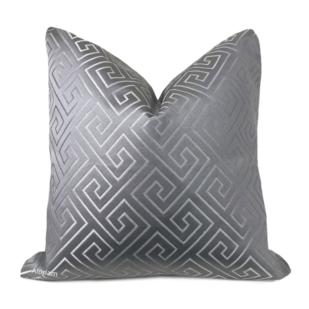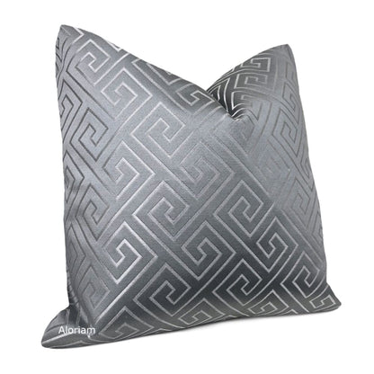 Theseus is a classic greek key pillow cover woven in gray with silver accents.