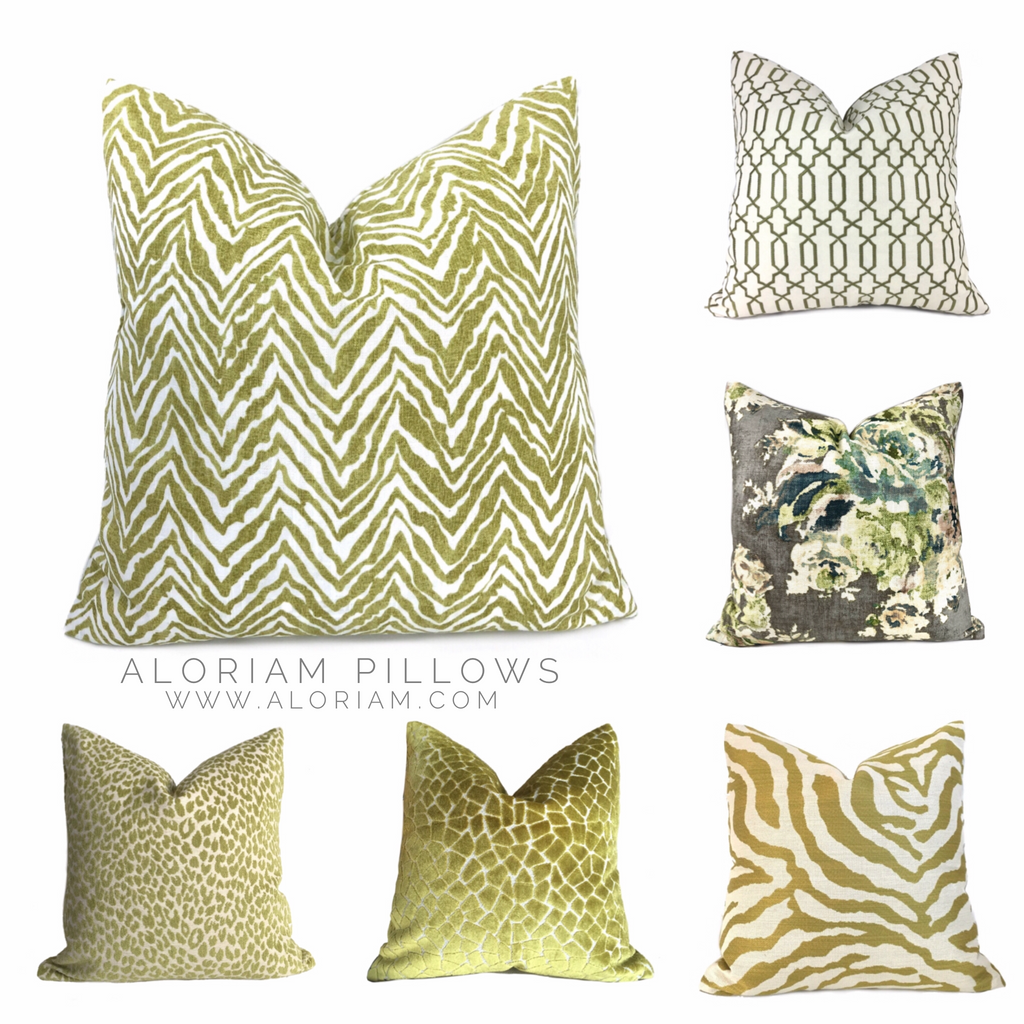 Almost sold out! This green and white animal print pillow cover is a cheerful addition to your home interior. Pattern drapery-weight cotton fabric with soil and stain repellent finish on both sides. Photographed on 17x17 cover (filled with 18x18 insert). Limited availability!