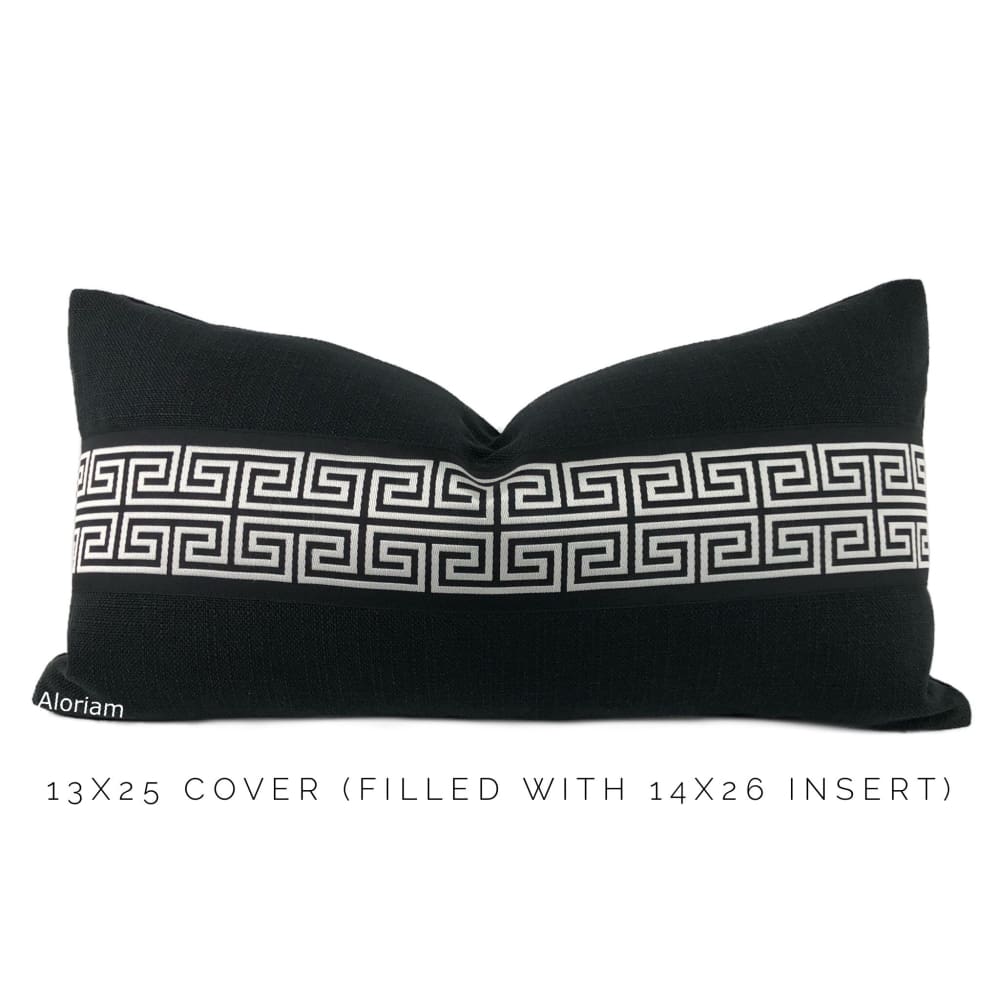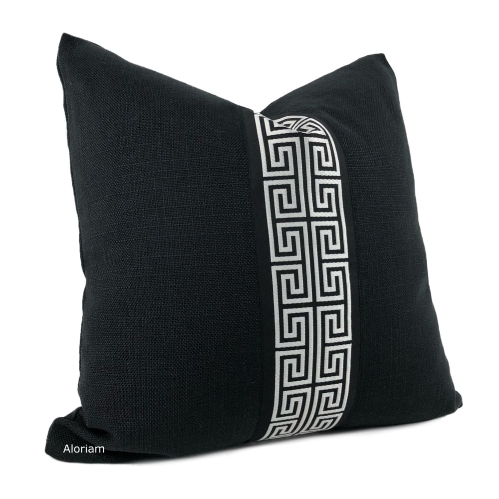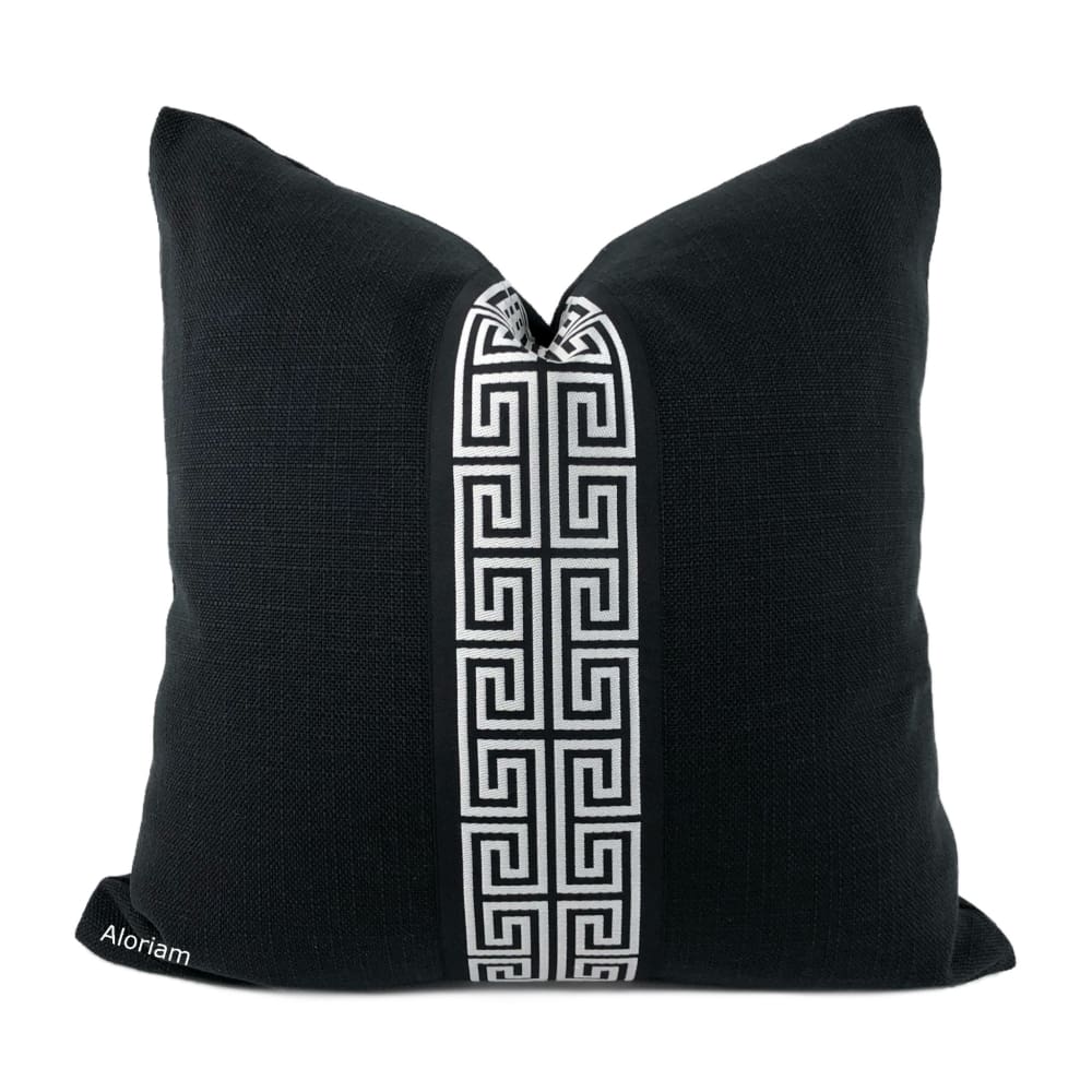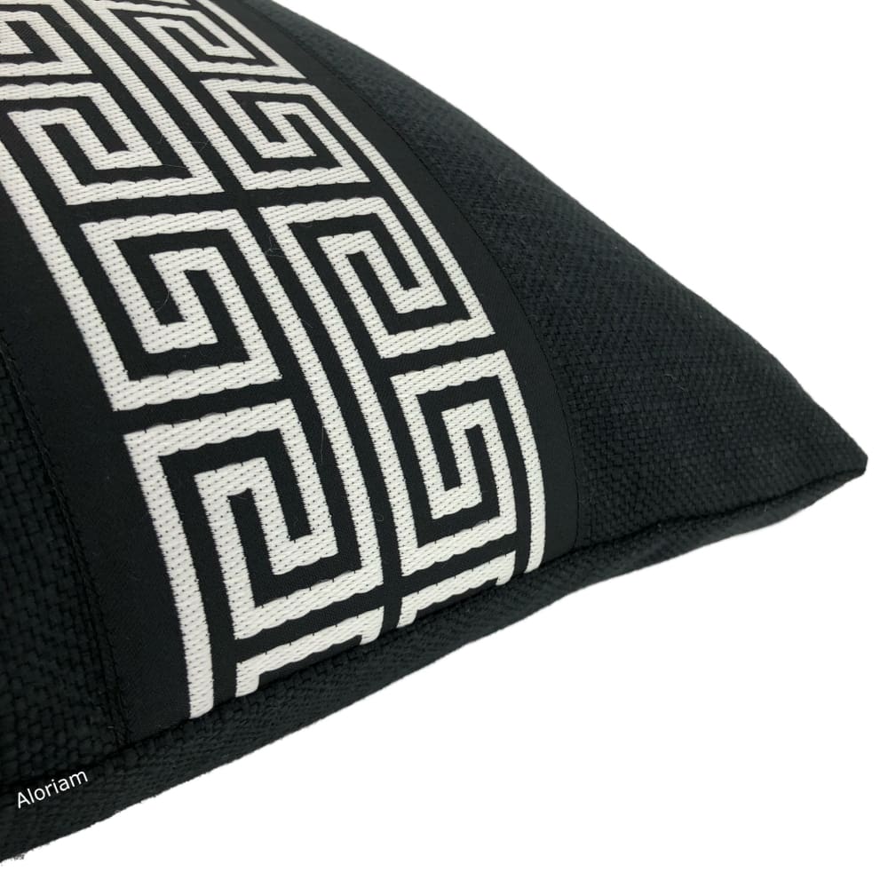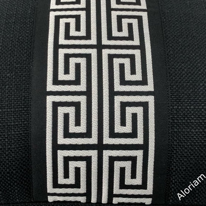 Titan is a black and white pillow cover accented by a bold 4 inch wide Greek key tape.