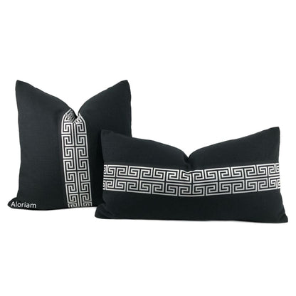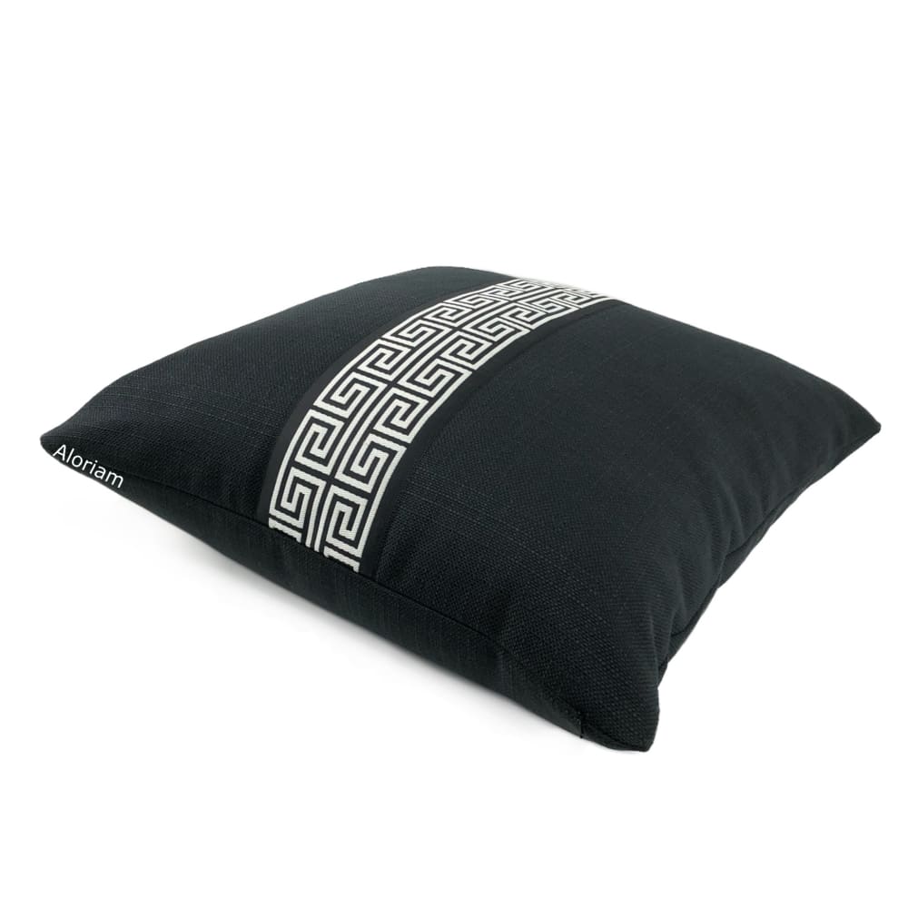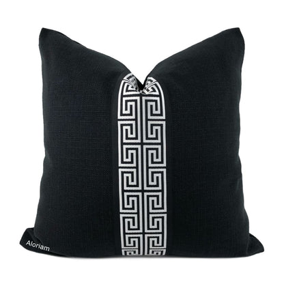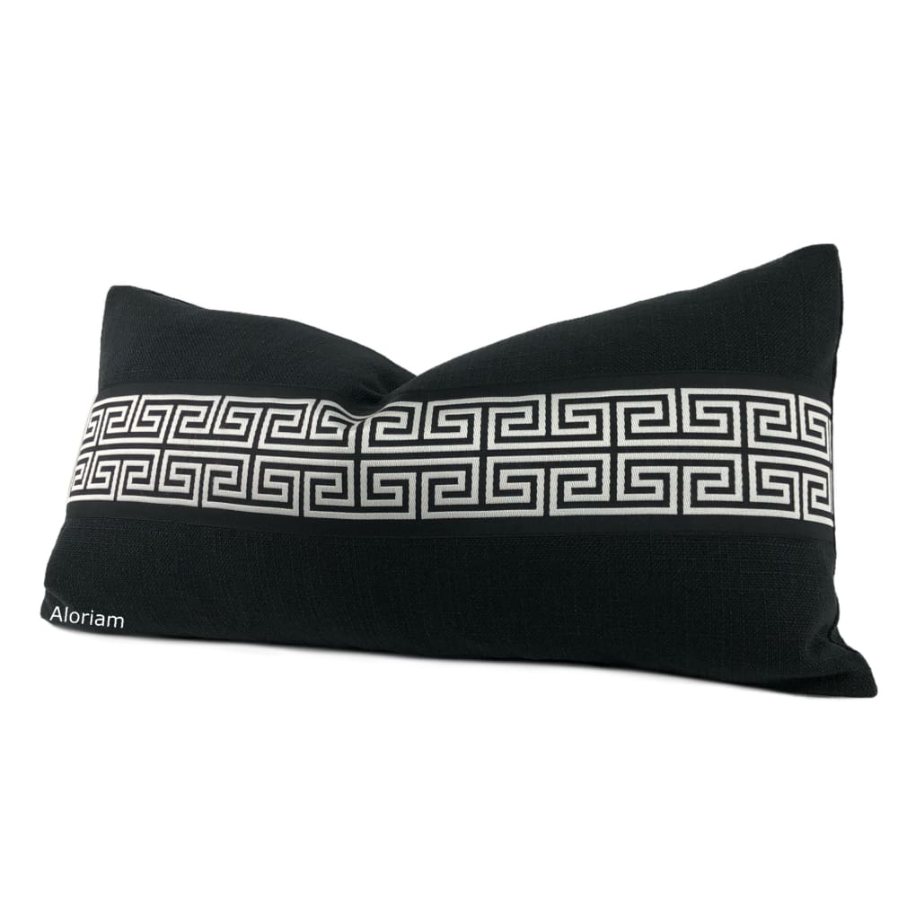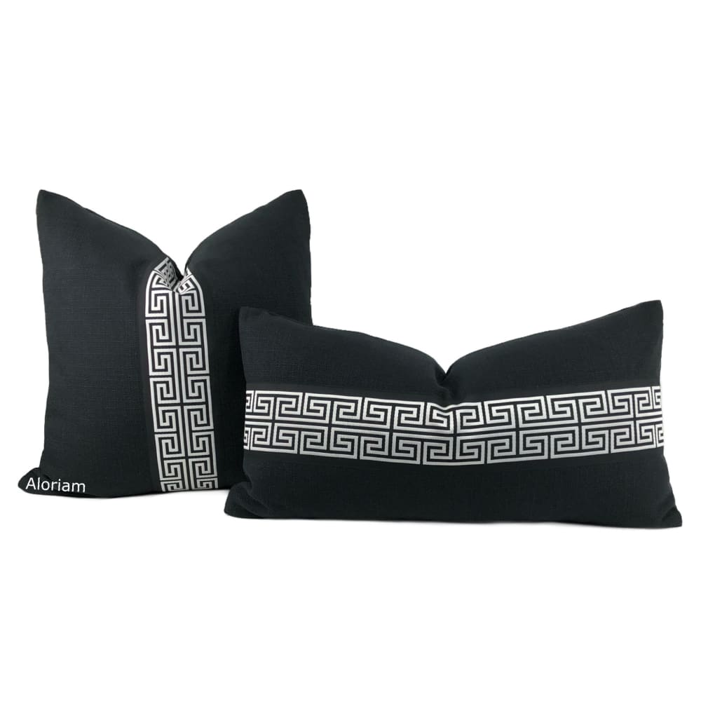 Titan is a black and white pillow cover accented by a bold 4 inch wide Greek key tape.