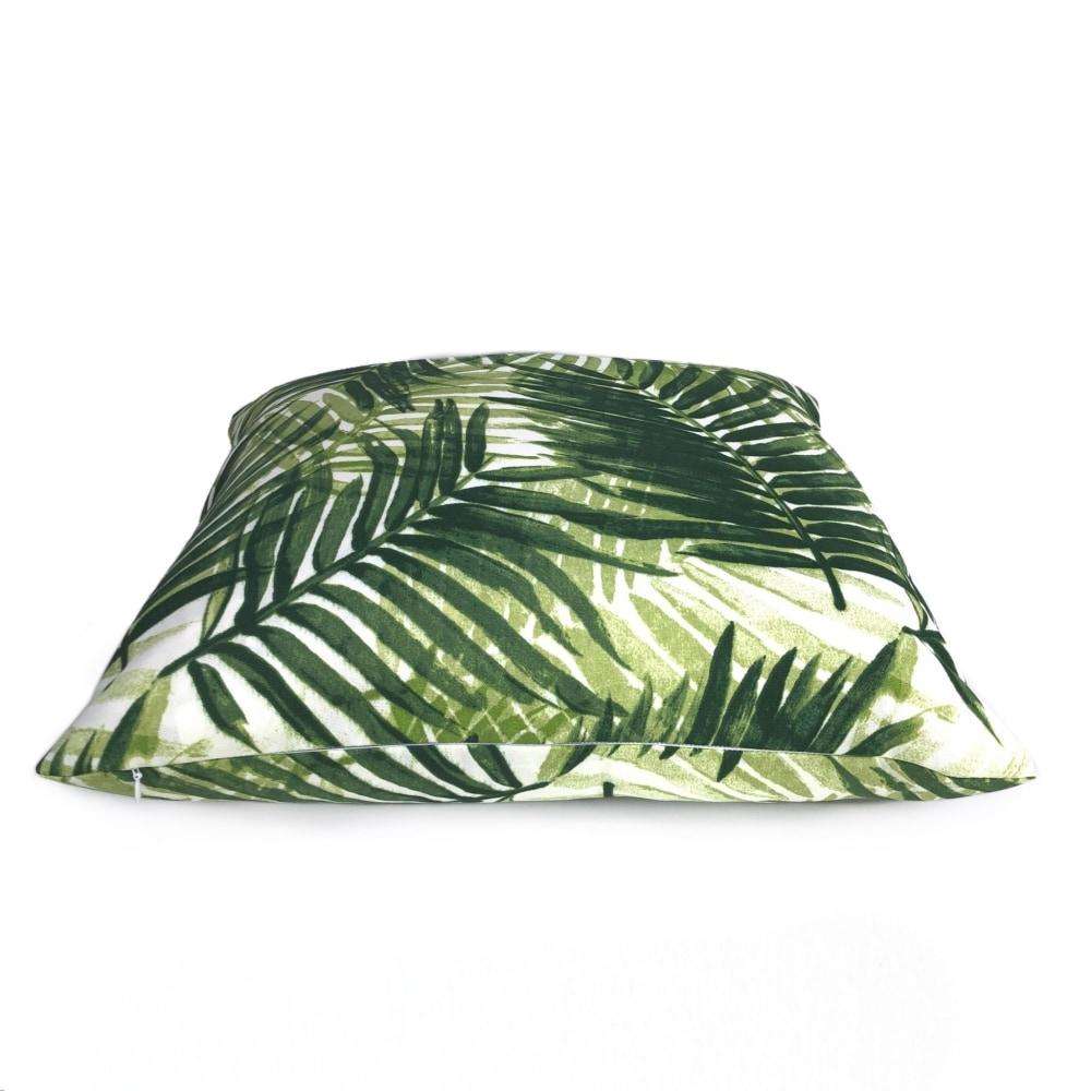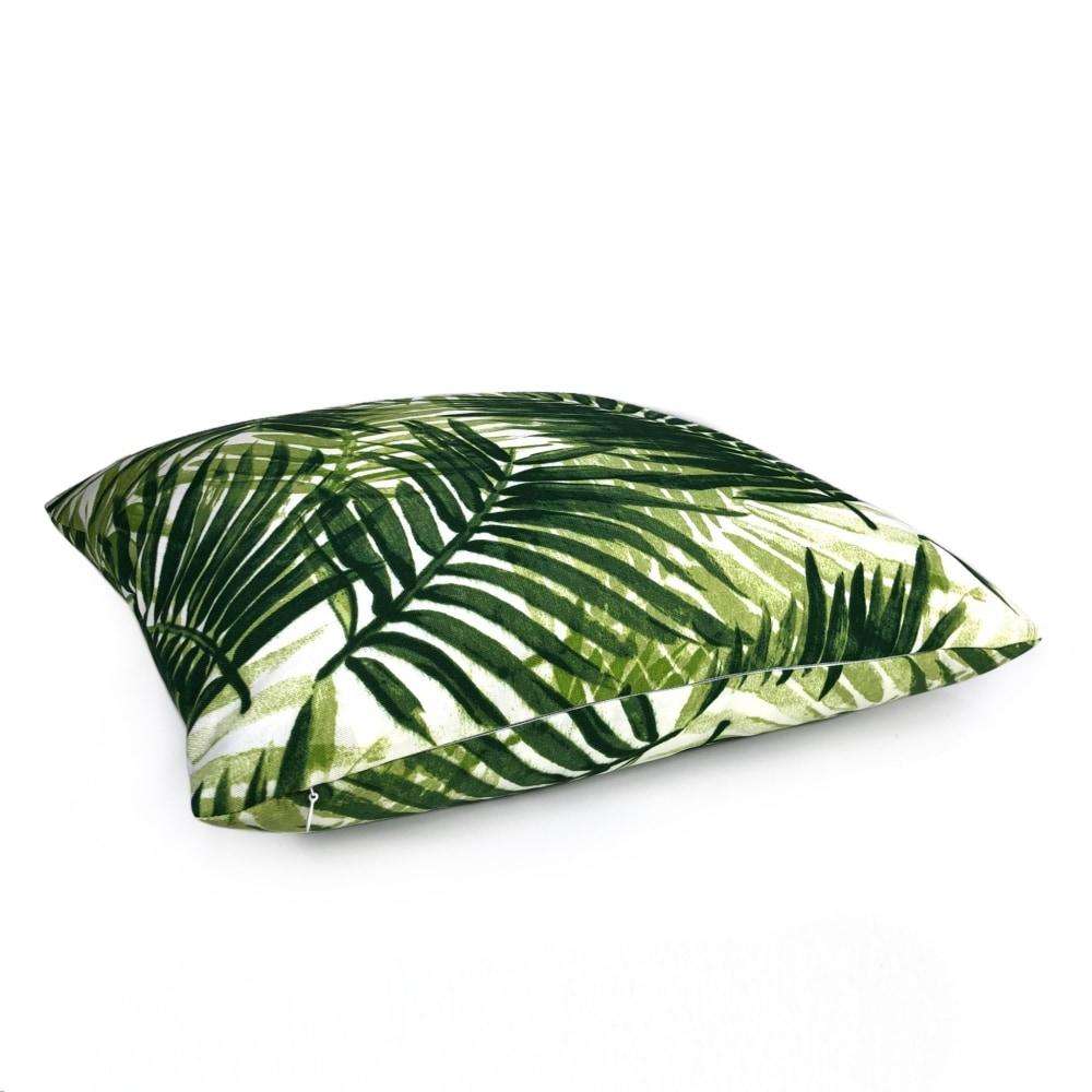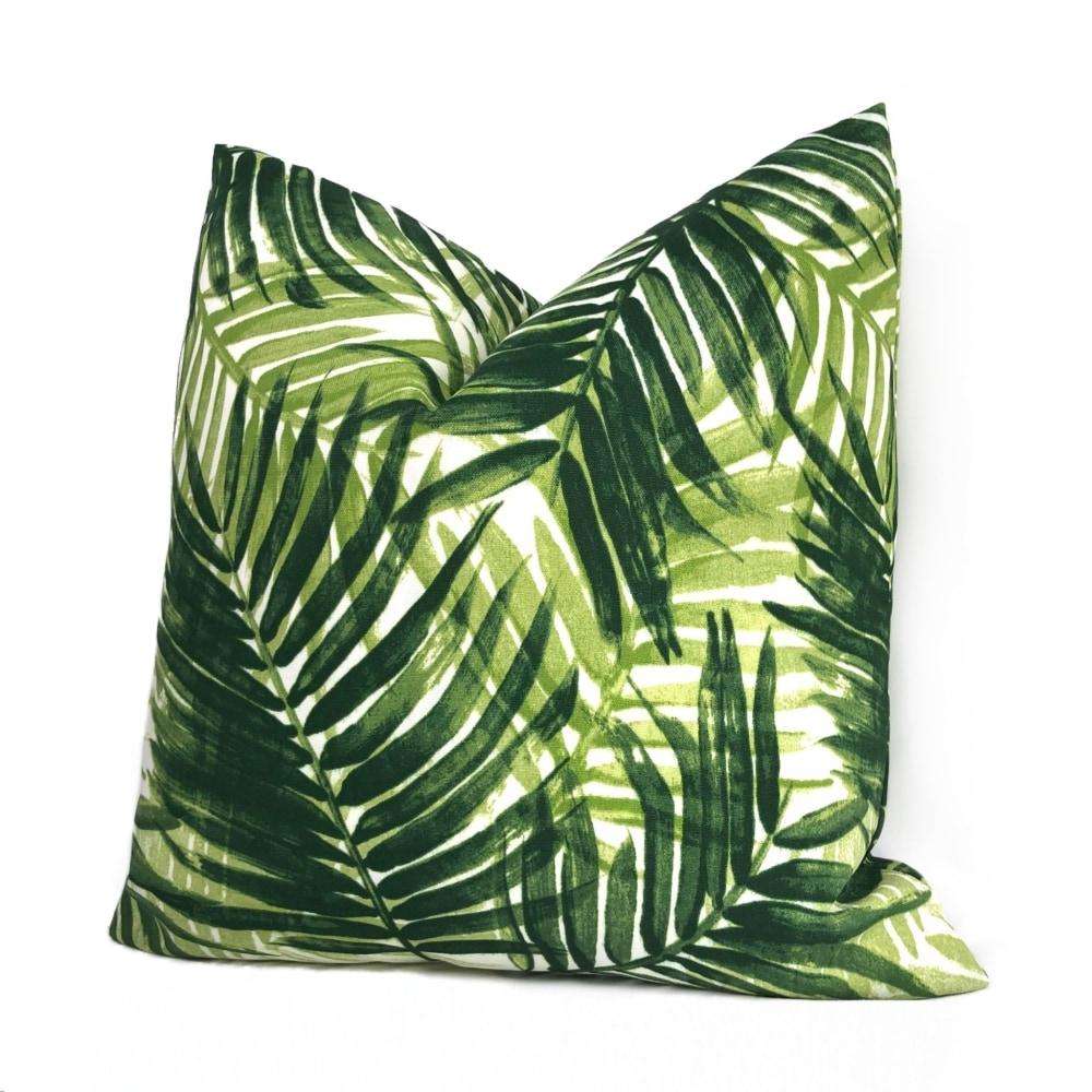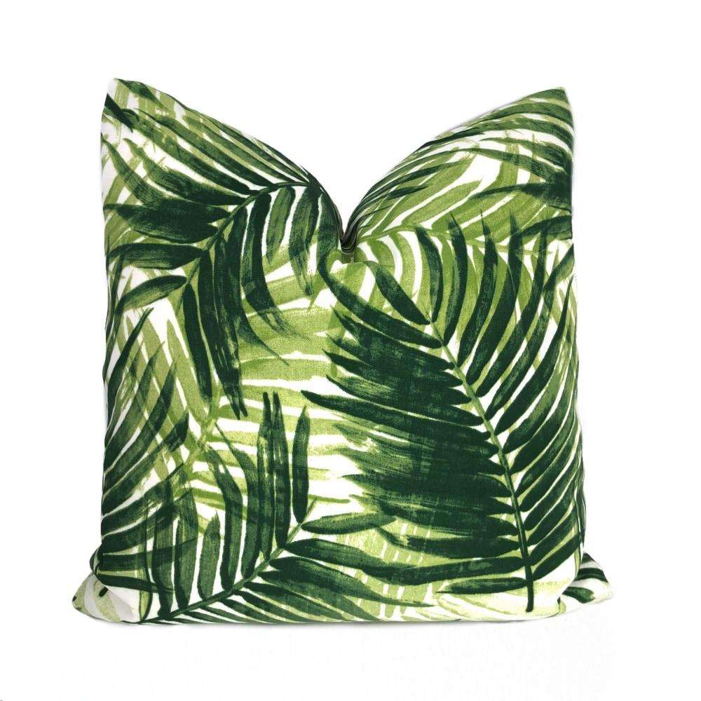 This green and cream pillow cover with an attractive tropical palm leaf print is perfect for decorating your outdoor porch or indoor sun room. This printed polyester fabric from Tommy Bahama is both soil and stain resistant and water repellent.