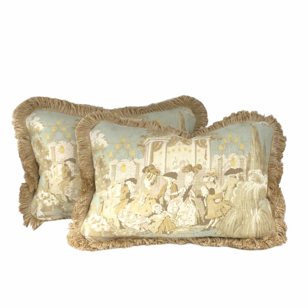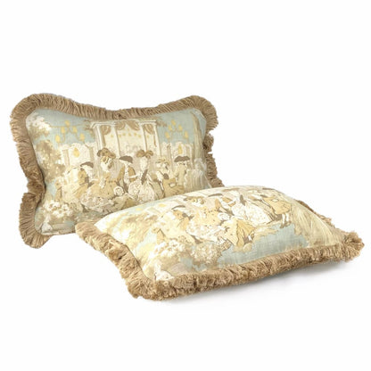 LAST ONE!  Bringing a little bit of Versailles home to you, this charming pillow cover depicts a courtly scene of ladies and gentlemen in 18th century dress. Only two pillow covers as shown available. Both cover fronts feature the same pictorial scene, with the backside cut from different segments of the same fabric.
