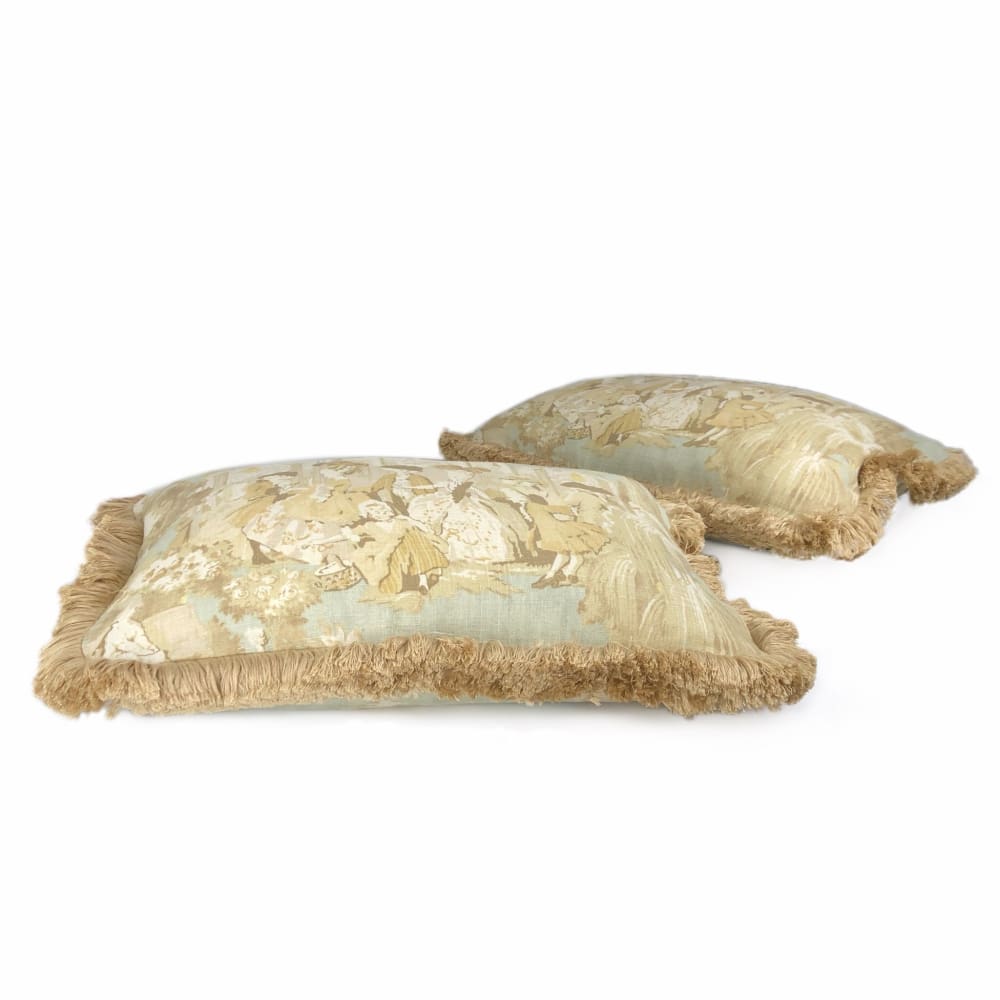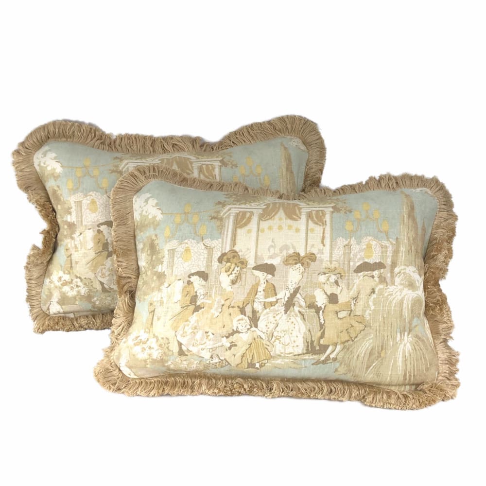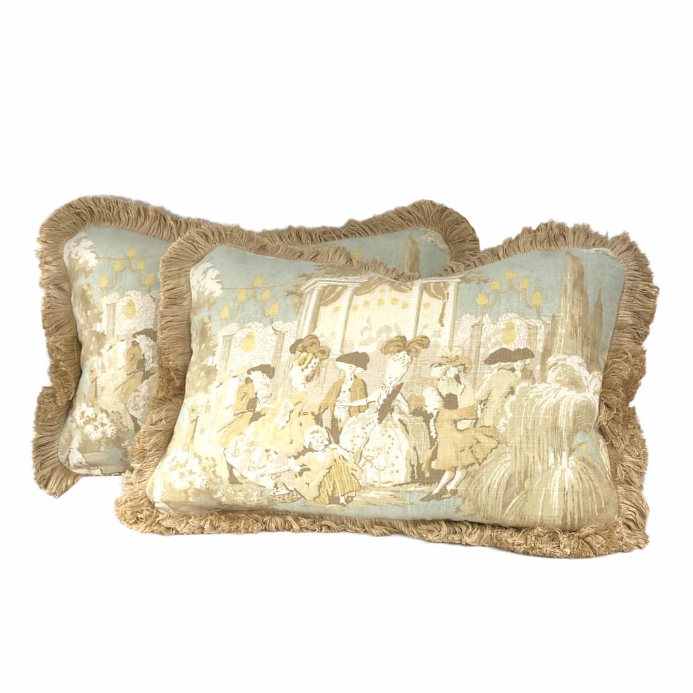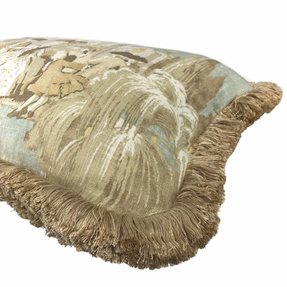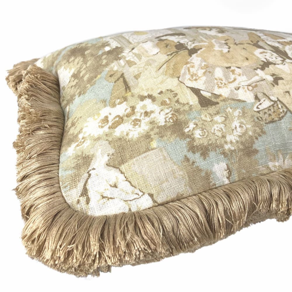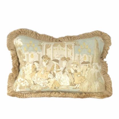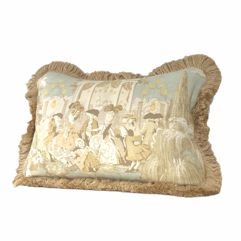 (CLEARANCE) Versailles Cream Spa Blue Toile Lumbar Pillow Cover with Brush Fringe Trim