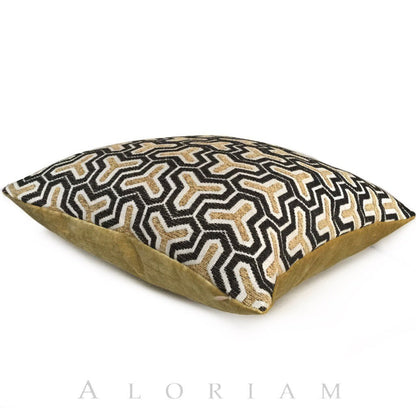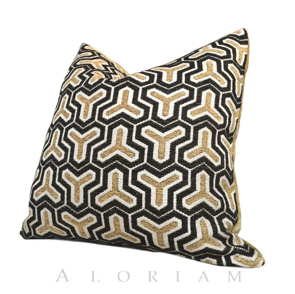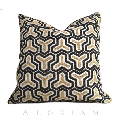 This eye catching geometric wishbone pattern pillow cover is woven in cream, camel beige and black-brown, reversing to a coordinating solid fabric on the backside.